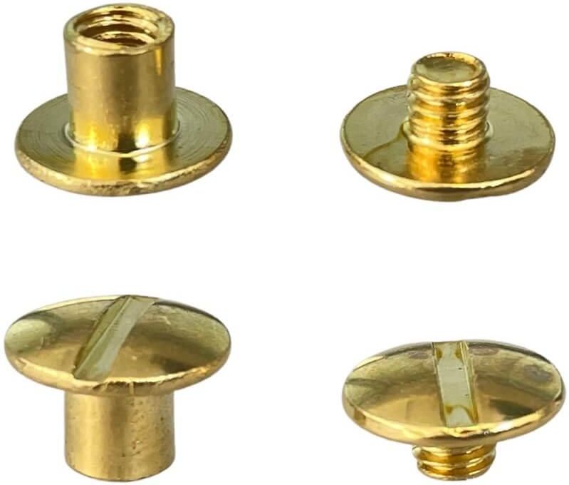 Nity skręcane Śrubka 8mm Złoty 5szt Nit skręcany , nit introligatorski , śrubka: średnica główki to 10mm ( jak na zdjęciu ) średnica nóżki to 5mm ( jak na zdjęciu ) wysokość po skręceniu 8mm (zdjęcie wymiar A) Kolor: złoty Cena za 5szt Nity skręcane służą do łączenia materiałów z możliwością …