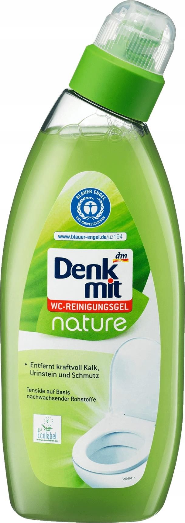 DENKMIT NATURE ŻEL DO CZYSZCZENIA WC EKOLOGICZNY Opakowanie : 750 ml (butelka z dozownikiem) Waga brutto: 900 g Praktyczny żel do czyszczenia WC Nature firmy Denkmit skutecznie usuwa kamień, brud i kamień z moczu oraz zapewnia naturalnie świeży zapach w Twojej toalecie. Dzięki Denkmit łazienka zawsze pachnie przyjemnie świeżością. Czyści i dezynfekuje. Skutecznie rozpuszcza zanieczyszczenia i osady oraz kamień. Zabija wszelkie bakterie i drobnoustroje Usuwa nieprzyjemny zapach, po użyciu ciesz się świeżym przyjemnym zapachem Zapobiega powstawaniu osadów i zanieczyszczeń Nie wymaga szorowania Produkt ulega biodegradacji Produkt ekologiczny i biodegradowalny polecany w przydomowych oczyszczalniach. Produkt przyjazny dla środowiska. Składniki oparte na surowcach odnawialnych i naturalnych aromatach Towar pochodzi z Niemiec Składniki: Mniej niż 5% anionowych środków powierzchniowo czynnych. Zawiera substancje zapachowe. Pozostałe składniki: barwniki.