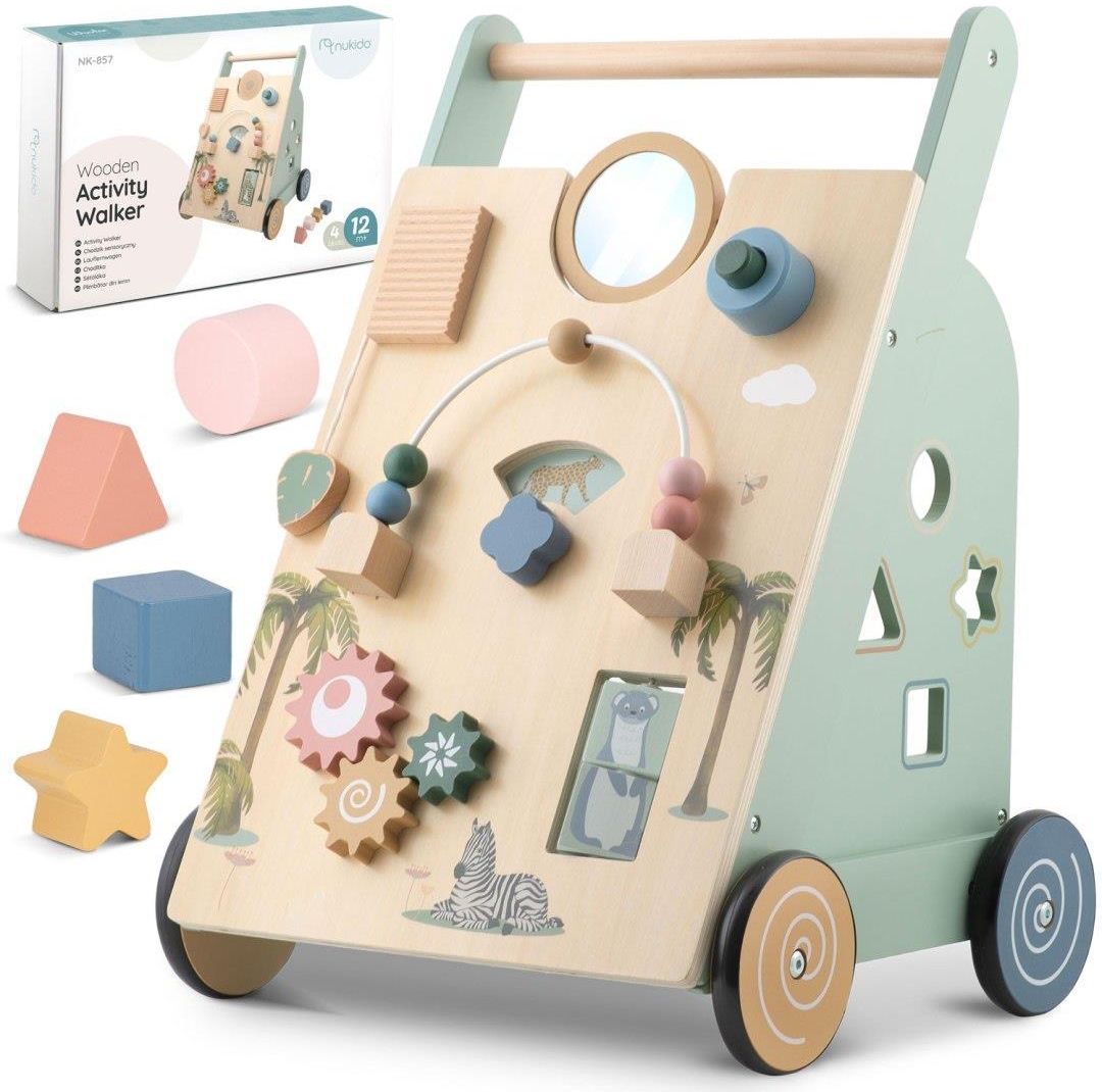 Drewniany chodzik dla dziecka pchacz sensoryczny jeździk do zabawy Nukido Chodzik pchacz sensoryczny drewniany Nukido: NK-857 Rozwój umiejętności motorycznych Stabilny chodzik zachęca do zabawy i eksploracji zdarzeń przyczynowo-skutkowych. Stymulacja zmysłów Stymuluje zmysły dziecka. Eksploracja tej zabawki zapewni Twojemu Maluszkowi czas pełen przyjemności i rozwoju. Inspiracja Montessori Czerpiąc inspirację z zasad Montessori, nasza zabawka wspiera aktywną, opartą na zmysłach naukę. Wiele możliwości można wykorzystać każdy wariant jako osobny element do nauki i zabawy, liczne kształty, kolory i ilustracje, wiele elementów do manipulacji i interakcji, dzięki wygodnemu podestowi pchacza po zabawie wszystkie klocki z sortera znajdą swoje miejsce, pozwala dziecku na łatwe przemieszczanie zabawki, sprzyjając aktywnej zabawie i rozwijaniu zdolności chodzenia. Zabawki z naturalnego drewna marki Nukido Trwałość i jakość premium – Zabawki wykonane z naturalnego drewna charakteryzują się długowiecznością i odpornością na uszkodzenia, co sprawia, że mogą służyć przez wiele lat. Ich solidna konstrukcja zapewnia bezpieczeństwo i niezawodność, przekładając się na zadowolenie rodziców i dzieci. Elegancja i minimalizm – Zabawki w jasnych, stonowanych kolorach doskonale wpisują się w nowoczesne, minimalistyczne wnętrza. Delikatna kolorystyka i prostota formy pomagają stworzyć estetyczne i spokojne otoczenie, sprzyjające rozwojowi dziecka. Umożliwia dziecku rozwijanie zdolności poznawczych poprzez dopasowywanie kształtów oraz stymulują kreatywność i wyobraźnię dzięki różnorodności kształtów, funkcji i barw. Uchwyt do prowadzenia — stabilny. Zabawka z liściem. Lusterko obrotowe. Przycisk z dźwiękiem. Liczydło, kulodrom. Obrotowy film ze zwierzętami. Zębatki obrotowe. Obrotowa układanka — zwierzątka. Ścieżka ze zwierzątkami. Stabilne, obrotowe kółka. Ergonomicznie dopasowane do dziecięcych rączek! Świetna zabawa *zabawka nie potrzebuje baterii, nie gra melodyjek. Ta zabawka jest doskonałym wyborem dla rodziców i opiekunów, którzy pragną wspierać rozwój swoich dzieci poprzez zabawę. Drewniany jeździk łączy elementy edukacyjne z fizyczną aktywnością, zachęcając dzieci do kreatywnego myślenia. Piękne, dopracowane detale. Trwałe materiały. Stonowane kolory. Nasz produkt sprawdzi się jako prezent, dzięki kolorowemu opakowaniu.
