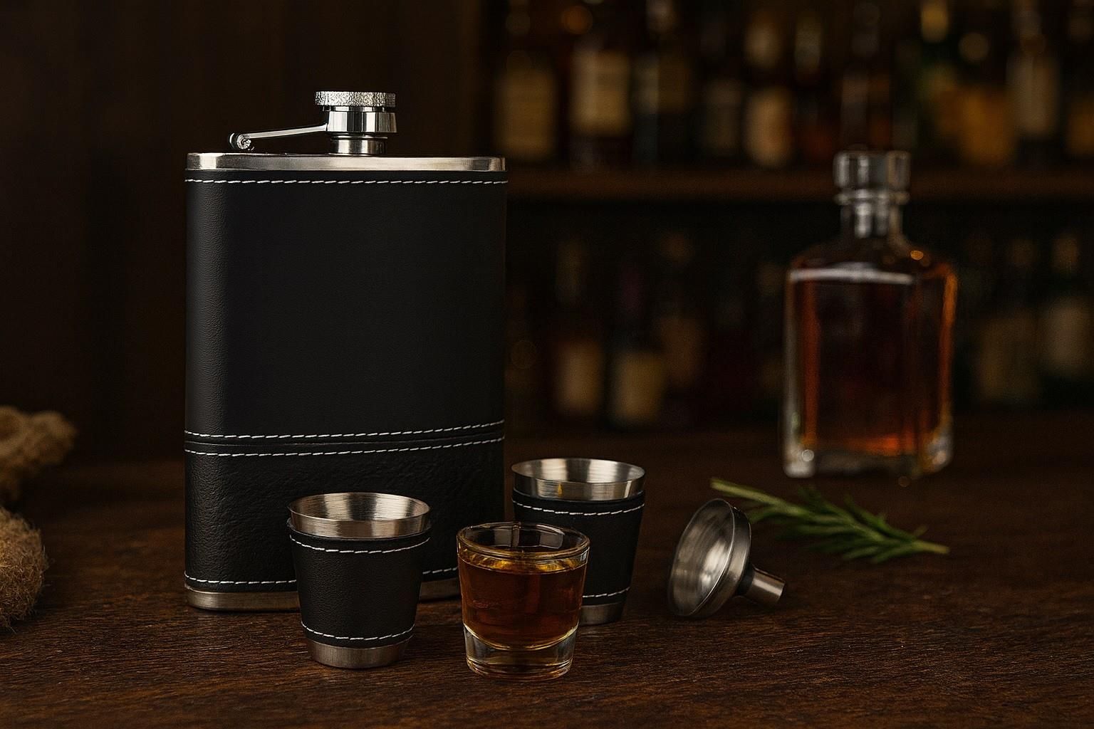 Elegancka piersiówka z kieliszkami i lejkiem w komplecie. Piersiówka ze stali nierdzewnej oprawiona jest w czarną eko-skórę przeszytą kontrastową nicią w kolorze białym. Kieliszki również. Całość zapakowana w gustowne, czarne pudełko z czerwoną tasiemką. Komplet zawiera piersiówkę ze stali nierdzewnej oprawioną w czarną eko-skórę cztery kieliszki lejek Zestaw idealny na prezent dla każdego mężczyzny, w ozdobnym opakowaniu z kokardą. Piersiówka wykonana jest ze stali nierdzewnej. Jej przeznaczeniem jest krótkotrwałe przechowywanie wysokoprocentowych alkoholi. Nie powinna być używana do napojów zawierających kwasy czyli np. soków czy nalewek. INSTRUKCJA OBSŁUGI: - przed pierwszym użyciem przepłukać środek piersiówki czystą wodą, - nie przechowywać alkoholu w piersiówce dłużej niż 3 dni. Napełniać przed samym użyciem, - po użyciu opróżnić piersiówkę, wypłukać czystą wodą i pozostawić na chwilę otwartą, aby umożliwić jej wyschnięcie, - jeżeli piersiówka jest oprawiona w eko skórę, należy uważać żeby nie przemoczyć jej powierzchni. Zdjęcia aranżacyjne mają charakter poglądowy. Prezentowana aranżacja może zawierać elementy dekoracyjne niewchodzące w skład zestawu. Szczegóły dotyczące zawartości znajdują się w opisie produktu.