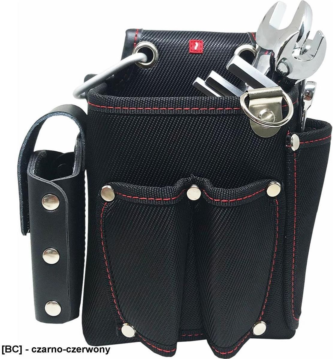 Kieszeń na narzędzia na pasek duża pojemna TOOLBOX rozmiar: długość 24, szerokość ok 10 cm Kieszeń na narzędzia zakładan na pasek wykonana z poliestru dodatkowo wzmocniona nitami wysokość 20 cm, szerokość około 17 cm, głębokość 10 cm pięć kieszeni na narzędzia: jedna duża oraz cztery mniejsze zakładana na pasek, dodatkowo metalowy karabińczyk usztywniana idealna dla monterów
