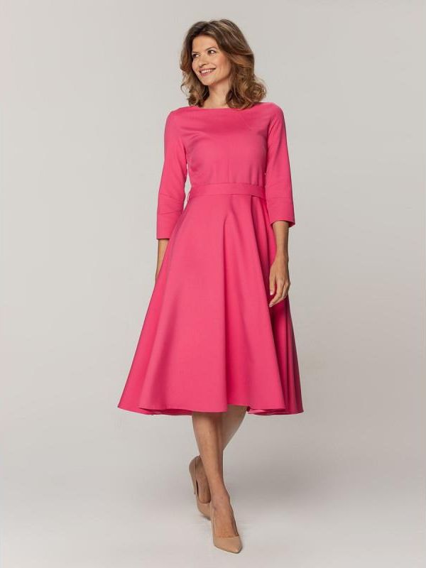 Rozkloszowana sukienka MIDI Elegancka sukienka MIDI z rozkloszowanym dołem i okrągłym dekoltem. Sukienka posiada rękaw 3/4 i jest zapinana na plecach za pomocą zamka błyskawicznego. Charakterystycznymi cechami tego modelu są dwie kieszenie oraz pasek, który można wiązać na wiele sposobów. Sukienka świetnie kamufluje niedoskonałości figury, a dzięki paskowi w talii tworzy piękną, klepsydrową sylwetkę. Kolor główny: różowa Długość rękawów: 3/4 Rodzaj sukienki: rozkloszowana, długość MIDI Skład tkaniny wierzchniej: 57% wiskoza, 40% poliester, 3% elastan Skład podszewki: 94% poliester, 6% elastan Wyprodukowano w Polsce Gwarancja: 24 m-ce