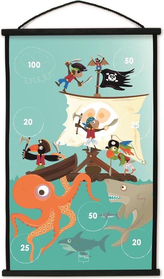 START TO DART _PIRACI - dwustronna tarcza z rzutkami z motywem Piratów. START TO DART - to bezpieczna zabawa dla młodszych wielbicieli rzutek. Gra polega na jak najbardziej precyzyjnym trafieniu rzutkami w tarczę, gdzie rozmieszczono punkty za każdy oddany rzut. Tarcza jest dwustronna co pozwala na zabawę na dwa różne sposoby. Do tarczy dołączono 6 sztuk bezpiecznych rzutek z gumową przyssawką. Dzięki temu rzutki mają odpowiednie wykończenie bezpieczne dla młodszych dzieci, które rozpoczynają zabawę w popularną grę w dart. Dart to znana i lubiana gra, która rozwija zręczność i koordynację ruchowo-wzrokową u dzieci. Wymiar tarczy: 38 x 60 cm Wiek: 3+ Klasa: 3+ Oprawa: pudełko Format: 410x198 mm