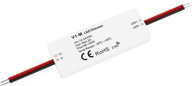 To urządzenie odbiorcze, służące do uzyskania sterowania nad monochromatycznym oświetleniem LED (np. taśma LED jednokolorową). Odbiornik V1-M umożliwia sterowanie jednego wyjścia, do którego podłączone oświetlenie LED może być dowolnie ściemniane oraz rozjaśniane za pomocą sygnału PWM. Podstawową formą komunikacji odbiornika V1-M jest bezprzewodowa droga radiowa, którą łączy się z pilotem do led bądź panelem naściennym led. Odbiornik V1-M wyróżnia się zakresem napięcia wejściowego rzędu 12-24V, prądem wyjściowym rzędu 5A oraz płynną pracą ściemniania PWM (2000Hz), co jest niezmiernie ważne dla naszego wzroku. Ponadto posiada bardzo niewielki wymiary. Wysoka jakość wykonania natomiast zapewnia 5 letni okres gwarancyjny. Zastosowanie do instalacji: MONO jednokolorowych Cechy odbiornika V1-M Dedykowany dla monochromatycznego oświetlenia LED Jeden kanał do wykorzystania Dopuszczalny maksymalny prąd o wartości 5A Pełna paleta współpracujących urządzeń nadawczych (piloty LED, panele naścienne LED) Komunikacja wykorzystująca drogę radiową 2.4Ghz Zasięg komunikacji do 30 metrów (automatyczna retransmisja sygnału radiowego) Możliwość przypisania dziesięciu urządzeń nadawczych Płynna praca sygnału PWM nie męcząca naszego wzroku (4096 poziomów ściemniania w zakresie 0-100%) Częstotliwość PWM dla sterownika LED - 2000Hz Dodatkowe zabezpieczenia - odwrócona polaryzacja Wykres ściemniania - logarytmiczny Minimalistyczna obudowa Certyfikat zgodności EU-RED (RED Radio Equipment Directive) Wysoka jakość zastosowanych komponentów 5 letnia gwarancja Poznaj serie produktu - odbiorniki LED miniaturowe Odbiorniki LED miniaturowe dedykowane są do bardzo małych obwodów bazujących na oświetleniu LED (np. taśmie LED). Ich obciążalność wyjściowa została zredukowana do minimum, tak by zapewnić maksymalnie małe rozmiary takich urządzeń. Pomimo takiego zabiegu, odbiorniki miniaturowe nie tracą na jakości, przez co są wytrzymałe i trwałe. Bezprzewodowa forma komunikacji sterowników LED – eliminacja kluczowych wad Urządzenia korzystające z bezprzewodowej komunikacji bazującej na drodze radiowej o określonej częstotliwości muszą w pełni precyzyjnie odbierać wysyłany sygnał i przekazywać go na wyjście urządzenia. Niestety sygnał ten często narażony jest na różnego typu zakłócenia wynikające z zewnętrznych czynników przez co zastosowanie większej ilości odbiorników LED było niegdyś kłopotliwe. Rozwiązaniem jakie oferują przedstawione produkty jest niewątpliwie automatyczna synchronizacja sygnału radiowego wraz z jego ponowną retransmisja. Pozwala to na jednoczesne załączanie wielu odbiorników bez efektu opóźnienia. Szczególnie jest to ważne w wielokolorowym oświetleniu LED, gdzie synchronizacja sygnału odgrywa kluczową role w ustalonych programach dynamicznych. Retransmisja natomiast zwiększa podstawowy zasięg komunikacji, co niewątpliwie zwiększa praktyczność instalacji LED. Krzywa ściemniania - charakterystyka pracy Ściemnianie logarytmiczne charakteryzuje się nieproporcjonalną zmianą sygnału PWM w stosunku do ustalonej jasności. W rzeczywistości - niskie wartości ściemniania led realizowanego np. poprzez czuły pilot do led czy panel naścienny będą w skokowy sposób widoczne na podłączonym oświetleniu, zwłaszcza przy niskich wartościach. Zgodnie z przedstawioną charakterystyką - przy ustaleniu na ściemniaczu led poziomu jasności 40% - uzyskamy wartość PWM na poziomie ~20%. A więc wykorzystanie 1/5 zakresu poziomu ściemniania dla ściemniacza do LED, podłączone oświetlenie. np. taśma LED, uzyska prawie połowę jasności. Przy wyższych wartościach >50% ściemnienia logarytmiczne jest dużo bardziej liniowe i płynne. Tak duża rozbieżność na niskich wartościach, wymaga odpowiedniej czułości aby ustalić żądany poziom jasności. Zatem przy tego typu ściemnianiu istotnym jest zastosować dogodny i wysokiej klasy ściemniacz LED. Odkryj unikalne funkcje sterowników LED