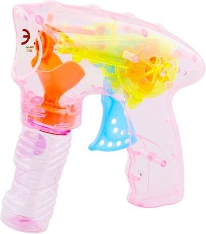 Pistolet na bańki mydlane + płyn 60 ml Pistolet na bańki mydlane łatwo wytwarza dużo bąbelków. Pistolet jest wyposażony w światło, które zapala się przy każdym „strzale”. Cechy: Łatwe i szybkie robienie baniek mydlanych Z oświetleniem LED Zawiera 60 ml płynu do baniek mydlanych Specyfikacja: Wymiary: 14.5 x 1.5 x 15.2 cm