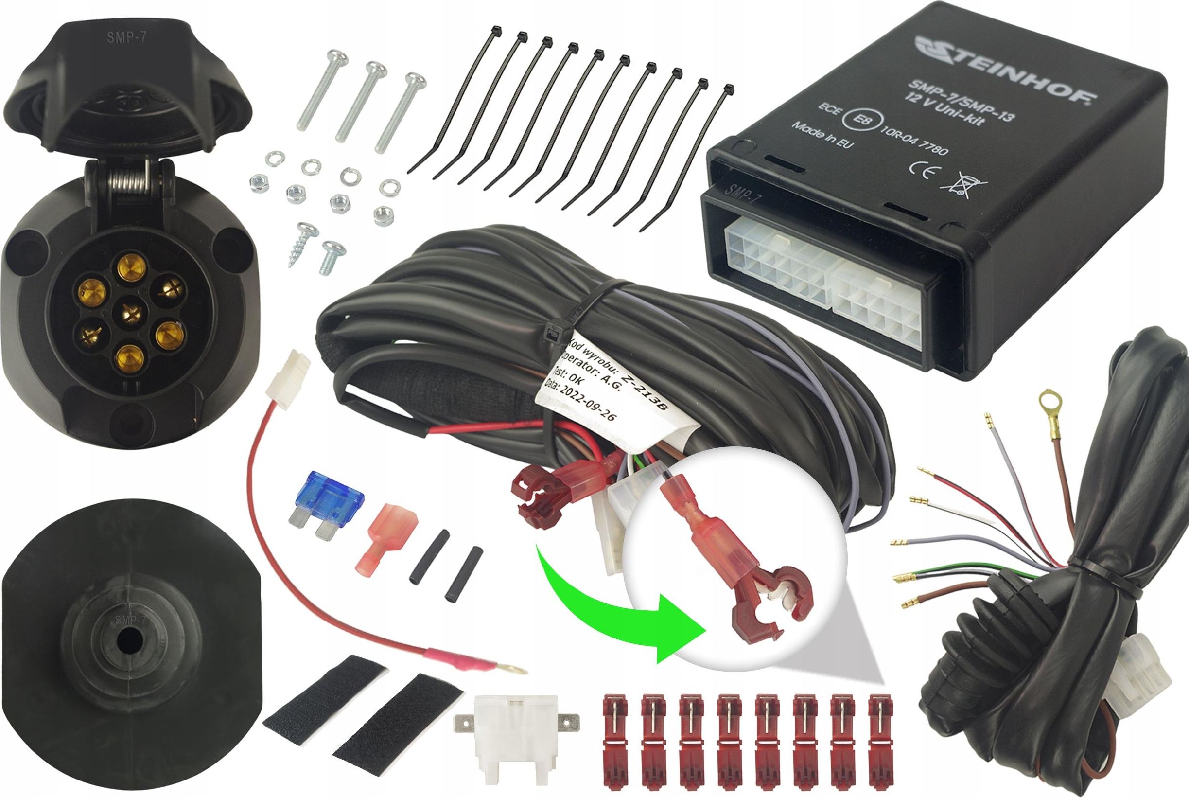 ZESTAW ELEKTRYCZNY HAKA HOLOWNICZEGO Z MODUŁEM 7 PIN Profesjonalnie zamontowana wiązka razem z dobrze dobranym hakiem holowniczym odpowiada za bezpieczeństwo na drodze podczas holowania. Została stworzona dla wymagających klientów, którzy jednocześnie liczą na korzystne cenowo mniej skomplikowane rozwiązania. ZASTOSOWANIE: wszystkie pojazdy z systemem sprawdzania sprawności żarówek Check-Control lub z magistralą CAN (komputer CanBus) do holowania przyczepek towarowych o DMC poniżej 750 kg PRODUKOWANY W POLSCE MODUŁ HAKA HOLOWNICZEGO WYŻSZEJ GENERACJI Nowoczesny bez przekaźnikowy moduł sterujący jest oparty na mikroprocesorach i oprogramowaniu, nie wykorzystuje mechanicznych przełączników ani przekaźników, dzięki temu jest niezawodny, cichy podczas pracy i godny polecenia. Uniwersalny moduł STEINHOF nie wymaga kodowania po zamontowaniu. Na uwagę zasługuję funkcja AUTO-TESTU - funkcja sprawdzania poprawności podłączenia przyczepki / bagażnika do pojazdu. Oraz dezaktywacja czujników parkowania. DANE TECHNICZNE Producent STEINHOF Numer katalogowy SMP-7 Kontrola awarii kierunkowskazów: dźwiękowa Obsługa czujników parkowania: tak Podłączenie zasilania z przodu Czas montażu od 60-90 minut Przewód ładowania: brak (opcja dla wiązek 13 pin) Stały plus: brak (opcja dla wiązek 13 pin) Pojazdy z kierownicą po lewej / prawej stronie Gniazdo: 7 PIN Ciężar [kg] 1.105 Indeks katalogowy: SMP-7 SZYBKOZŁĄCZKI PREMIUM Szybkozłączki montowane w zakończone wtyczką przewody wiązki elektrycznej dzięki czemu ograniczymamy się do pojedynczego wkucia w przewody MODUŁ NOWEJ GENERACJI Większość dostępnych modułów instalacji haka holowniczego swój system operacyjny opiera na przekaźnikach, których praca wiąże się z mało komfortowym dźwiękiem. Moduł Steinhof posiada mikroprocesory bardzo podobne to tych które stosuje się w modułach dedykowanych. DODATKOWA USZCZELKA W zestawie znajduje się gumowa przelotka uszczelniająca przejście przewodów z karoserii do belki haka.