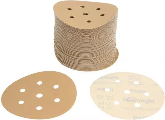 Papier ścierny, gold, krążek 150mm, gradacja p500, liczba otworów: 7, mocowanie: rzep, opakowanie 100szt., wodoodporność: nie, kolor beżowy.
