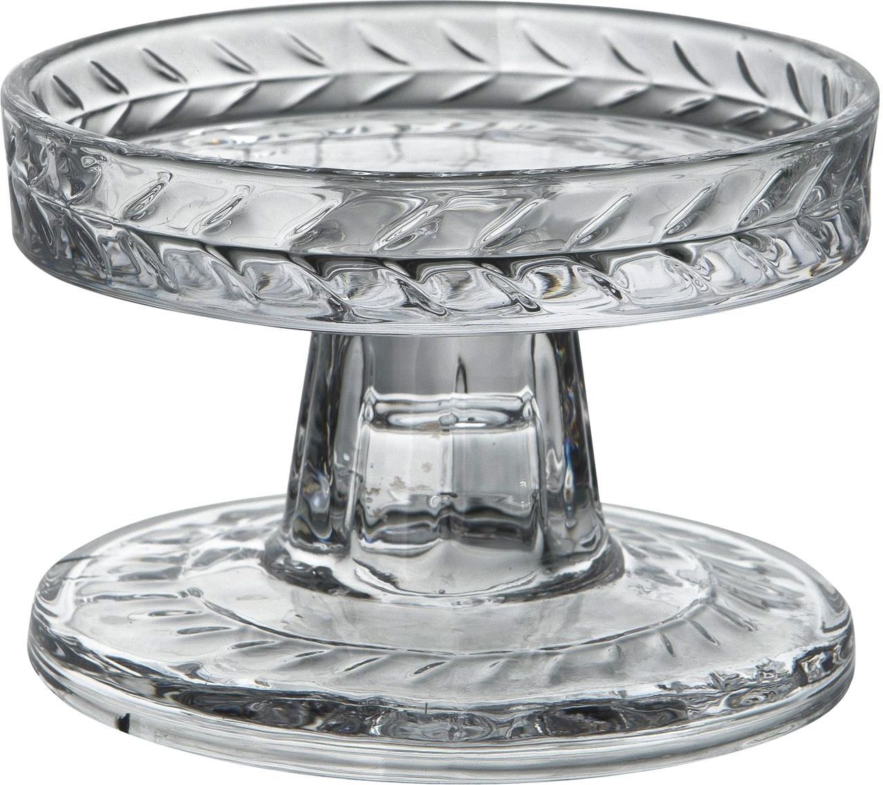 Elegancki świecznik szklany o kolistej formie. Znajduje zastosowanie dla tradycyjnych świec stożkowych, świec typu walec o średnicy nie większej niż 8cm oraz kuli. Lekko podniesiony brzeg posiada delikatny wzór na szkle. Praktyczny element dekoracji stołu podczas imprez okolicznościowych, a także na co dzień. Świecznik ze świecą nadaje wnętrzu ciepłej atmosfery, dodaje blasku. Taca oraz świeczki widoczne na zdjęciach służy celom dekoracji.