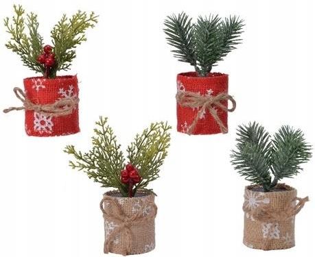 Sztuczna roślina w jucie 13 cm stroik świąteczny dekoracyjny Mała zimowa gałązka w dekoracyjnej doniczce to urokliwy element, który wprowadza zimowy klimat do wnętrza. Ozdobna doniczka, dostępna w kolorach czerwonym i zielonym, ma wymiary 5x5x13 cm, co sprawia, że jest idealna do ustawienia na …