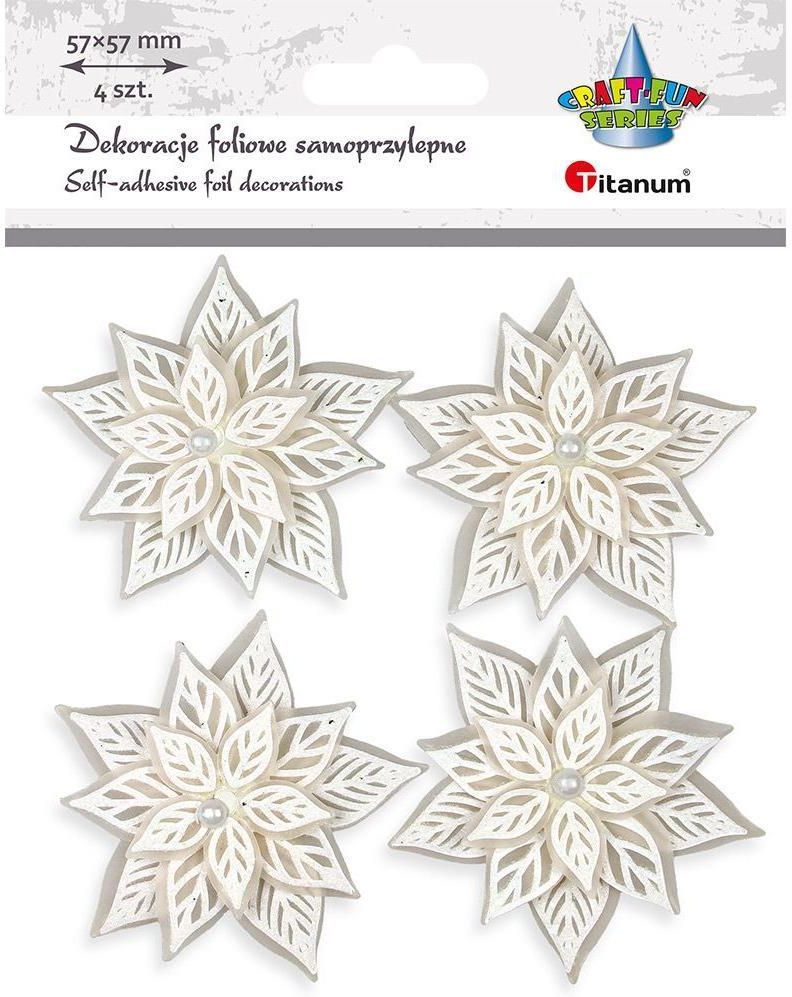 Samoprzylepne Ozdoby Foliowe 3D Poinsecje w Kształcie 60 x 57 mm, Kolor Biały z Perełką, 4 Sztuki Dekoracje Foliowe Samoprzylepne 3D Poinsecje dodadzą uroku każdej pracy plastycznej dzięki swojemu trójwymiarowemu wyglądowi. Wykonane z lekkiej i trwałej folii, są łatwe do zaaplikowania na dowolne powierzchnie. Ich rozmiar to 60 x 57 mm, a kolor to elegancki biały, który wpasuje się w każdy projekt.Każdy z czterech dostępnych w zestawie poinsecji posiada dodatkowo błyszczącą perełkę, która nadaje całości wyjątkowego blasku. EAN: 5903714543397