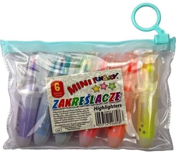 Pisaki Do ZAKREŚLANIA Zakreślacz Do TEKSTU Marker Fun&Joy, 6 kolorów 1-4mm Producent: Fun&Joy Zestaw 6 zakreślaczy w rozmiarze mini Okrągła obudowa zamykana przezroczystą skuwką wypełnioną błyszczącymi gwiazdkami w kolorze tuszu Grubość linii pisania 1-4 mm Pakowane w praktyczny woreczek na suwak. Dlaczego warto kupić nasze zakreślacze Zakreślacze nie wysychają Wyraźne i nasycone kolory zakreślaczy Te artykuły piśmiennicze idealnie nadają się do szkoły jak i do biura Przybory szkolne najwyższej jakości Idealnie nadają się do podkreślania treści Wytrzymały pigment, dzięki czemu można nimi długo pisać Śliczne kolorki Wygodne uchwyty idealne dla dłoni dziecka Zakreślacze nie rozmazują się Dobrze napigmentowany tusz Zakreślacze są wydajne i w pełni bezpieczne Uwielbiane zakreślacze przez wielu klientów Zakreślacze te nie pozostawiają żadnych smug oraz nie wysychają Świetnie sprawdzą się zarówno u młodszych i starszych artystów