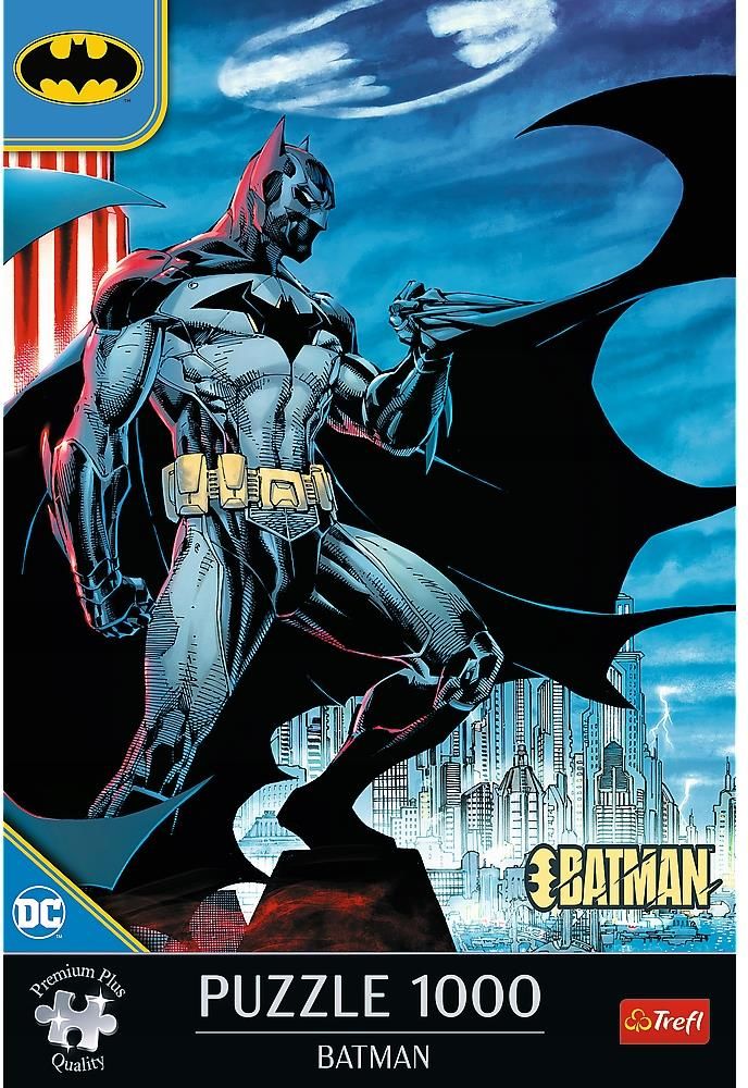 Puzzle Premium Plus Quality Batman 1000 el. Premium Plus Quality — nowa jakość układania puzzli. Poznaj układanki, które wyróżnia doskonałe dopasowanie elementów, wysokiej jakości tektura i wyselekcjonowane obrazy. W opakowaniu znajdziesz plakat, który ułatwi układanie. Puzzle Batman przedstawiają sylwetkę tytułowego superbohatera. Po ich ułożeniu powstanie obraz o wymiarach 683x480 mm. Układanka wchodzi w skład niezwykłej serii, która przeniesie Cię do świata w którym wszystko jest możliwe i przypomni przygodny bohaterów znanych filmów, seriali i bajek. Puzzle produkowane od lat! Od 1985 roku w Trefl SA poświęcamy się temu, aby zagwarantować niezapomniane doznania podczas układania puzzli, które produkowane są w 100% w Polsce. Nasze układanki tworzymy z pasją, a każdy element cechuje wysoka jakość wykonania.  Dzięki wykorzystaniu papieru niwelującego odbicie światła, sprawiamy, że układanie staje się jeszcze przyjemniejsze. Po ułożeniu puzzli możesz utrwalić obrazek klejem i powiesić swoje dzieło na ścianie.  Zalety układania puzzli Puzzle to świetna rozrywka dla każdego, niezależnie od wieku czy umiejętności. To także dobry trening dla umysłu i ciała. Układając, wyrównujemy oddech, tempo bicia serca oraz spada ciśnienie krwi. Kompletowanie układanki uczy cierpliwości i wytrwałości, co przekłada się na umiejętności przydatne w codziennym życiu. Odkryj nową pasję już dziś! Szukasz pomysłu na miły wieczór w domowym zaciszu? Układanie puzzli to świetny sposób na spędzenie wolnego czasu w gronie przyjaciół i rodziny a do tego rewelacyjny trening dla mózgu. Szeroki wybór wzorów pozwala wybrać układankę dopasowaną do Twoich zainteresowań. Puzzle są doskonałym prezentem z okazji urodzin lub świąt. Odkryj Niezbędnik Puzzlomaniaka!