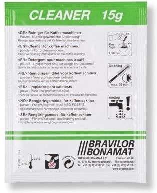 Cleaner 15x15g - Bravilor Bonamat Produkt do czyszczenia Cleaner usuwa z urządzeń pozostałości po kawie i herbacie, przywracając prawdziwy smak napoju i zapobiegając zapychaniu się elementów. Opakowanie: 15 saszetek po 15g każda.