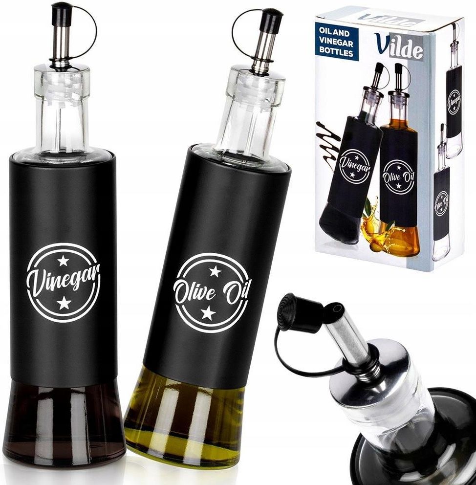 Butelki z dozownikiem na oliwę i ocet 300ml Zestaw dwóch butelek z dozownikami do oliwy i octu. Wykonane z solidnych materiałów. Zestaw będzie ozdobą zarówno stołu, jak i kuchni. Dzięki butelkom będziemy w odpowiedni sposób przechowywać oliwę oraz ocet. Zakończone są praktycznym dozownikiem, który pomoże uniknąć rozlania zawartości i pozwala odmierzyć odpowiednią ilość. Oryginalny produkt marki Vilde. Wyprodukowano zgodnie z europejskimi standardami. Materiał: szkło Długość: 6,5 cm Szerokość: 6,5 cm Wysokość: 24 cm Pojemność: 2x 300 ml Waga (g): 608 Kolor dominujący: czarny Cechy Zestaw dwóch butelek do oliwy i octu - Zestaw dwóch butelek z dozownikami do oliwy i octu. Każda butelka ma wymiary 6,5 x 6,5 x 24 cm oraz pojemność 300 ml. Solidnie wykonane - Butelki wykonane z wysokiej jakości szkła, z metalową obudową w modnym, czarnym kolorze. Precyzyjny dozownik - Butelki wyposażone w dozowniki z zatyczkami, które spowalniają przepływ oliwy i octu. Umożliwia to wygodne dozowanie, a także pozwala na równomierne rozprowadzanie oliwy lub octu na potrawie. Zatyczki zabezpieczają zawartość przed wylaniem i utrzymują świeżość na dłużej. Praktyczne oznaczenia - Wyraźne napisy "Olive Oil" i "Vinegar" na butelkach precyzyjnie określają przeznaczenie, ułatwiając odróżnienie oliwy od octu. Uniwersalne zastosowanie - Butelki na oliwę i ocet świetnie sprawdzą się zarówno w użytku domowym, jak również w gastronomii.