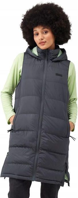 Damska kamizelka firmy REGATTA model: RWB124 ZBY kolor: grafitowy Przytulny i odporny na warunki pogodowe, damski bezrękawnik Ganella o wydłużonym kroju to idealna warstwa odzieży na okres przejściowy. Dzięki zastosowaniu wysokiej jakości ociepliny świetnie chroni przed zimnem i zapewnia wysoki komfort termiczny. Wypełnienie Feather Free to wysokiej jakości syntetyczna izolacja puchowa, która została wykonana z materiałów pochodzących z recyklingu i skutecznie chroni przed chłodem, będąc jednocześnie alternatywą dla puchu naturalnego. Zewnętrzny materiał został pokryty trwałą, hydrofobową impregnacją, która zabezpiecza przed lekkim deszczem i wilgocią. Bezrękawnik posiada zintegrowany kaptur ze ściągaczem, który zapewnia dodatkową ochronę głowy i szyi przed wiatrem. Wyposażony jest w dwie dolne kieszenie na zamek oraz bezpieczną wewnętrzną kieszeń zapinaną na zamek. Ciekawym rozwiązaniem jest funkcjonalny zamek błyskawiczny w bocznym szwie, który zwiększa komfort i swobodę ruchów. Został zaprojektowany jako wszechstronna warstwa docieplająca. Można go nosić samodzielnie na polar w dni o łagodniejszej aurze lub jako warstwę środkową pod kurtkę dla dodatkowego ciepła w chłodniejsze dni. Produkt został wykonany z materiałów pochodzących z recyklingu, a zastosowana ocieplina jest w 100% syntetyczna (pochodzenia niezwierzęcego). Szczegóły produktu: materiał zewnętrzny: 100% Poliester (62 g/m²) podszewka: 100% Tafta poliestrowa ocieplina: Feather Free (syntetyczny puch z recyklingu) gramatura ociepliny: 250 g/m² impregnacja: Trwała hydrofobowa (DWR) kieszenie: 2 dolne na zamek, 1 wewnętrzna na zamek kaptur: Zintegrowany, z regulacją technologia: Feather Free