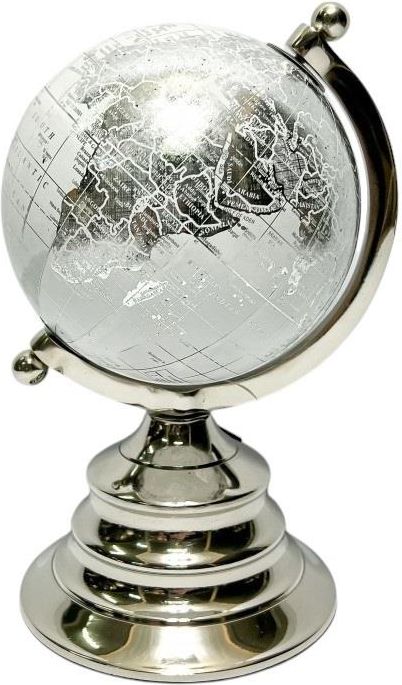 Globus w kolorze srebra to elegancka ozdoba każdego biurka, komody czy witryny. Model kuli ziemskiej, został wykonany z tworzywa sztucznego. Całość stoi na metalowej podstawie. Oś wykonana została z metalu, dzięki której globus można obracać. Połyskujący globus wykonany jest natomiast z tworzywa wysokiej jakości, które prezentuje się znakomicie. Wykonany został z dbałością, o każdy najmniejszy szczegół. Globus jest znakomitym pomysłem na prezent, dla fana astronomii czy geografii. Doskonała pomoc naukowa dla dzieci.