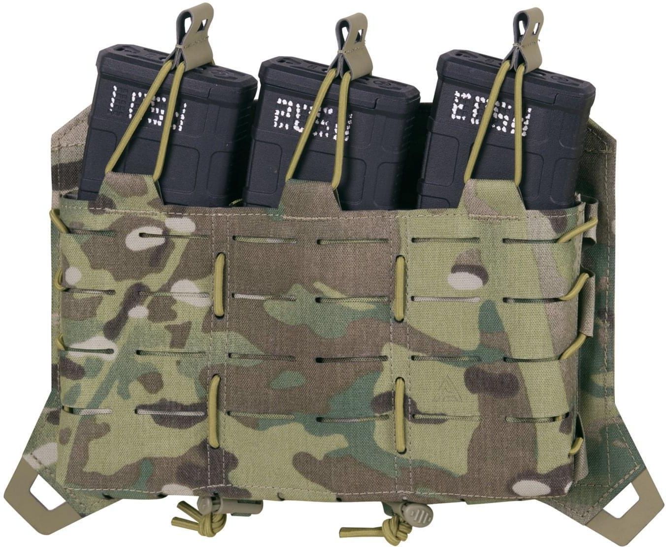 Zrobiona z wytrzymałego materiału Cordura ładownica na trzy magazynki. Dopasowana do mocowania w bocznych otworach przedniego panelu kamizelki Spitfire. Kieszeń wyposażona jest w regulację wysokości oraz boczne ściany z elastycznych ściągaczy, dzięki czemu może pomieścić magazynek o różnej wielkości.Przednia powierzchnia kieszeni pokryta została laserowo ciętym systemem modułowym kompatybilnym z systemem mocowań MOLLE/PALS. Ładownica dedykowana na magazynki do AR, AK lub SR. Kieszeń zamykana jest od góry gumowym oplotem. Rozwiązanie te umożliwia szeroki zakres regulacji i zabezpiecza urządzenia przed przypadkowym wypadnięciem.