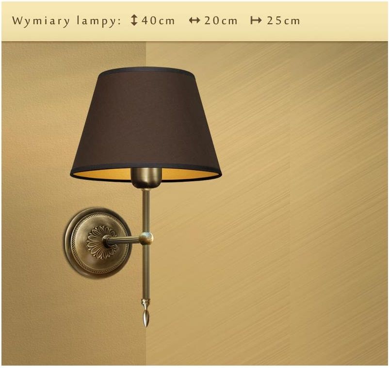 Stylowy kinkiet z mosiądzu z abażurem. - Wykonany w całości z elementów z pełnego mosiądzu. Mosiądz to trwały, szlachetny i ponadczasowy materiał - kliknij, aby dowiedzieć się więcej. - Wykończenie mosiądzu: złota patyna. - Zawiera odlewy mosiężne importowane z Włoch. - Abażur ciemny brąz ze złotym środkiem lub (symbol lampy LA-K1) ecru lub cappuccino zdobione wypukłymi złotymi paskami . - Wymiary całkowite: wysokość 40cm, głębokość 25cm, średnica abażura 20cm, wysokość abażura 16cm. - Żródło światła: 1xE27 (żarówka tradycyjna/żarowa o mocy max. 60W) lub żarówka energooszczędna albo LED o większej mocy (np. odpowiednik 100W). Lampa jest fabrycznie nowa, wyprodukowana w Polsce. Gwarancja: 24 miesiące. Seria L - zobacz wszystkie lampy