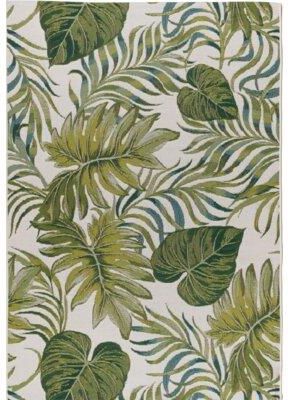 Dywan zewnętrzny Cappucino marki MULTIDECOR o wymiarach 160 x 235 cm w kształcie prostokąta, tkany na płasko. Roślinne wzory w odcieniach zielono-beżowych nadają mu egzotycznego charakteru i wprowadzają klimat tropikalnego raju.