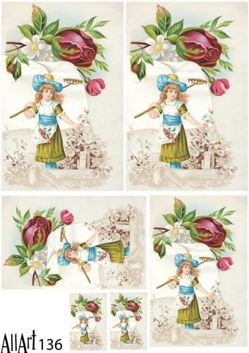 Papier decoupage 210x297mm A4 - AllArt 136 - ogrodniczka 5612 Idealnie nadaje się do wszystkich technik decoupage. Papier około 60g, o wymiarach 210x297mm (A4)