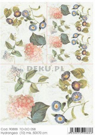 Papier do decoupage B2 50x70 - TO-DO 58 1269 HYDRANGEA PAPIER DO DECOUPAGE’U TO-DO SOFT PAPER to jedyny papier do decoupage’u na świecie objęty patentem, idealnie dopasowuje się do kształtów dekorowanych przedmiotów. Jego unikatowe właściwości techniczne oraz wysoka jakość artystyczna czynią z niego produkt jedyny w swoim rodzaju, stworzony specjalnie do decoupage’u. Papier ten jest bardzo trwały i wygodny w użyciu. Nie wymaga moczenia przed klejeniem. oryginalne włoskie wzornictwo odporny na wysokie temperatury trwałe kolory bardzo wytrzymały idealny na każdą powierzchnię: metal, porcelanę, karton, drewno, tkaninę, wosk nie zawiera ligniny ani kwasów właściwość tkaniny (elastyczny pod wpływem wilgoci) cienki Wymiar: 50 x 70 cm