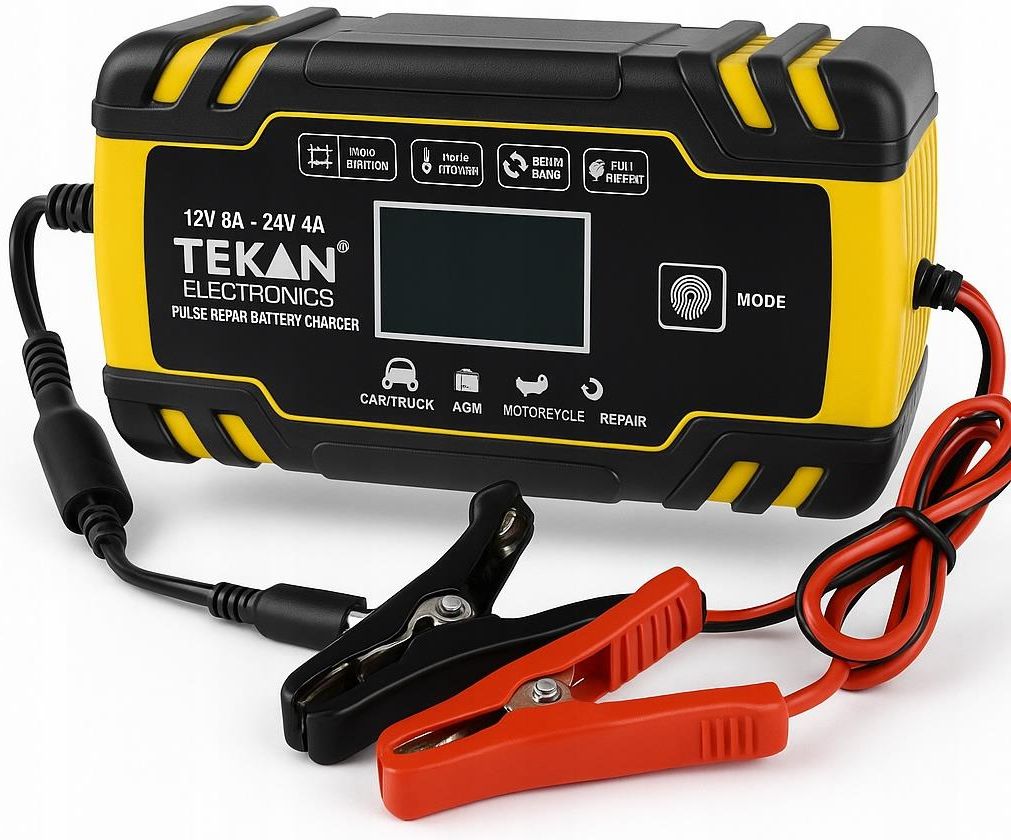 Prostownik mikroprocesorowy TEKAN 12V/24V 8A 4A – inteligentna naprawa i ładowanie akumulatorów Nowoczesny, w pełni automatyczny prostownik TEKAN Electronics to zaawansowane urządzenie stworzone do szybkiego i bezpiecznego ładowania akumulatorów samochodowych, motocyklowych, AGM, GEL, SLA oraz klasycznych akumulatorów kwasowo-ołowiowych. Wyposażony w mikroprocesor, tryb naprawy Pulse Repair oraz duży wyświetlacz LCD, oferuje maksymalną skuteczność i prostotę obsługi. Najważniejsze zalety Automatyczny tryb pracy – podłącz i zapomnij Urządzenie samodzielnie dopasowuje parametry ładowania do typu i stanu akumulatora. Obsługa akumulatorów 12V i 24V Idealny do: samochodów osobowych, dostawczych, motocykli, quadów, maszyn rolniczych. Tryb Pulse Repair – regeneracja zasiarczonych akumulatorów Specjalny algorytm impulsowy może przywrócić pojemność słabym akumulatorom i wydłużyć ich żywotność. Wyświetlacz LCD – pełna kontrola Pokazuje aktualne napięcie, procent naładowania, tryb pracy, temperaturę i status ładowania. Pełna ochrona Wbudowane zabezpieczenia: przeciwzwarciowe przed przegrzaniem przed odwrotną polaryzacją przed przeładowaniem 12V – prąd ładowania 8A 24V – prąd ładowania 4A Cichy, kompaktowy, wydajny Ergonomiczna konstrukcja i wydajne chłodzenie gwarantują komfortową pracę przez wiele lat. Specyfikacja techniczna Model: TEKAN Electronics Pulse Repair Battery Charger Napięcie wejściowe: 220–240V Napięcie wyjściowe: 12V / 24V Prąd ładowania: 8A (12V), 4A (24V) Obsługiwane typy akumulatorów: AGM, GEL, SLA, WET Funkcje: MCU Control, Temp Detection, Repair Mode, Full Protect Wyświetlacz: LCD Długość przewodów: ok. 1 m Kolor: czarno-żółty Szerokie możliwości zastosowania z akumulatorami w różnych pojazdach samochody motocykle quady skutery śnieżne skutery wodne busy/dostawczaki ciężarówki kosiarki i sprzęt ogrodowy traktorki łodzie pojazdy elektryczne typu melex inne pojazdy z akumulatorem Zestaw zawiera Prostownik TEKAN 12V/24V Przewody z krokodylkami Instrukcja obsługi Oryginalne opakowanie Dlaczego warto wybrać TEKAN? To prostownik łączący jakość, wydajność i nowoczesną technologię. Idealny zarówno do domowego garażu, jak i małego warsztatu.