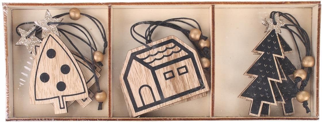 ZESTAW 9x OZDOBA ŚWIĄTECZNA - CHOINKI, DOMKI KOD: DNS-19A0244 Wysokość (cm): 2 Szerokość (cm): 8 Długość (cm): 24 Surowiec: Drewno ZESTAW OZDÓB ŚWIĄTECZNYCH 9 SZT. - CHOINKI, DOMKI Komplet 9 drewnianych ozdób choinkowych to prawdziwy świąteczny niezbędnik! Jest zapakowany w gustowne pudełeczko, dzięki któremu nada się także na wspaniały prezent - uszczęśliwisz nim każdą osobę, która przygotowania do Bożego Narodzenia zaczyna zaraz po powrocie z letniego urlopu. Ozdoby występują w kilku wariantach, dzięki czemu kupując kilka pudełeczek możesz stworzyć swój własny zestaw. Przeznaczenie: świąteczne ozdoby na choinkę, elementy wianków bożonarodzeniowych, dekoracja domu Zawartość kompletu 3x ozdoba w kształcie choinki w kropki 3x ozdoba w kształcie domku 3x ozdoba w kształcie czarnej choinki SPECYFIKACJA Wymiary zawieszek Zawieszka w kształcie choinki w kropki: szerokość: 4,5 cm długość bez sznurka: 8 cm długość całkowita: 17 cm Zawieszka w kształcie domku: szerokość: 6 cm długość bez sznurka: 5 cm długość całkowita: 15 cm Zawieszka w kształcie czarnej choinki: szerokość: 3 cm długość bez sznurka: 8 cm długość całkowita: 17 cm Cechy produktu zestaw zawiera 9 szt. ozdób świątecznych wykonane z naturalnego materiału: drewna kolor: odcienie beżu, czerni i złota