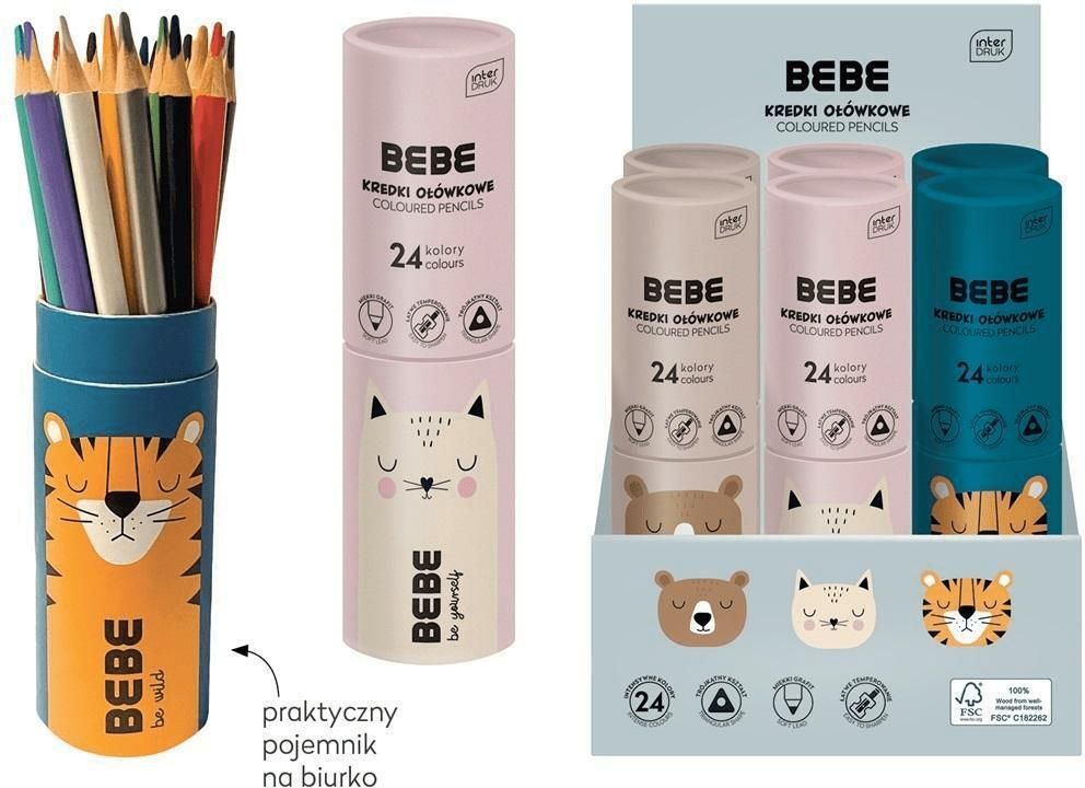 KREDKI OŁÓWKOWE SZKOLNE TRÓJKĄTNE W TUBIE 24 INTENSYWNE KOLORY BB FRIENDS KREDKI OŁÓWKOWE SZKOLNE TRÓJKĄTNE W TUBIE 24 INTENSYWNE KOLORY BB FRIENDS Rozpocznij swoją artystyczną podróż z kredkami ołówkowymi Interdruk w 24 żywych kolorach. Oto ich cechy charakterystyczne: Żywe kolory: Bogata paleta 24 kolorów, która ożywi Twoje twórcze projekty. Kartonowa tuba: Kredki zapakowane są w wytrzymałą kartonową tubę, która pełni funkcję praktycznego pojemnika, doskonałego zarówno do przechowywania w domu, jak i na biurku w szkole. Przekrój trójkątny: Kredki posiadają trójkątny przekrój, co pomaga kształtować odpowiednie ułożenie palców podczas pracy, zapewniając wygodę i precyzję. Wzory tub: Kredki są dostępne w 3 uroczych wzorach tub: miś, kotek i tygrysek. Miękkość i wytrzymałość: Kredki Interdruk charakteryzują się miękkością, co ułatwia ich aplikację, jednocześnie nie są łamliwe, co zapewnia długotrwałą przyjemność z ich użytkowania. Rozpocznij swoje artystyczne projekty już dziś z kredkami ołówkowymi Interdruk w tubie! Wiek - 3+ Ilość kolorów - 24 Wymiary opakowania - 19,5 x 5 cm Kod produktu - P2202B Producent - Interdruk