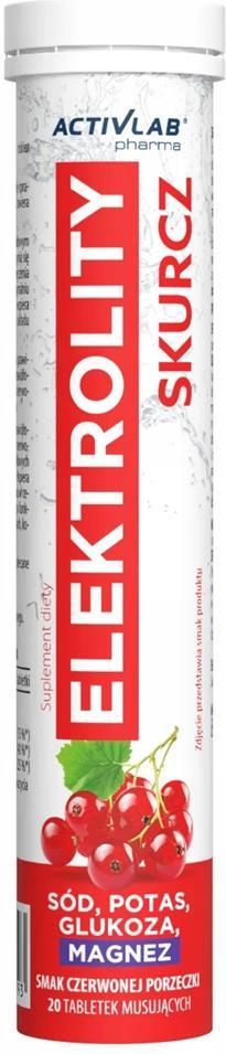 Activlab Pharma Elektrolity Skurcz to suplement diety w formie tabletek musujących o smaku czerwonej porzeczki. Zawiera zestaw składników mineralnych wspierających organizm podczas wysiłku fizycznego oraz w codziennym funkcjonowaniu. Źródło elektrolitów, wzbogacone o magnez i witaminę C. Skład: Wielkość opakowania: 20 tabletek musujących Porcja jednorazowa: 1 tabletka Ilość porcji w opakowaniu: 20 Składniki1 tabletkaRWS3 tabletkiRWSGlukoza400 mg1200 mgSód264 mg792 mgPotas100 mg5%300 mg5%Magnez50 mg13,3%150 mg40%Witamina C60 mg75%180 mg225% RWS - Dzienna referencyjna wartość spożycia Nie ustalono dziennej referencyjnej wartości spożycia Składniki: Regulator kwasowości: kwas cytrynowy, diwęglan sodu, substancja wypełniająca: sorbitol, glukoza, diwęglan potasu, węglan magnezu, koncentrat buraka czerwonego, aromat, kwas L-askorbinowy, substancja przeciwzbrylająca: glikol polietylenowy, substancja słodząca: sukraloza. Produkt może zawierać pochodne: zbóż zawierających gluten, soi, mleka. Sposób użycia: 1 tabletkę rozpuść w 200 ml chłodnej wody. Spożywać 3 tabletki dziennie. Przeciwwskazania: Nadwrażliwość na którykolwiek ze składników preparatu. W okresie ciąży i karmienia piersią przed zastosowaniem należy skonsultować się z lekarzem lub farmaceutą. Przechowywanie: Przechowywać w suchym i ciemnym miejscu, w temperaturze 0-25ºC, w sposób niedostępny dla małych dzieci. Informacja: Produkt nie może być stosowany jako substytut (zamiennik) prawidłowo zróżnicowanej diety. Zrównoważony sposób żywienia i prawidłowy tryb życia jest ważny dla funkcjonowania organizmu człowieka. Nie należy przekraczać maksymalnej zalecanej porcji do spożycia w ciągu dnia.