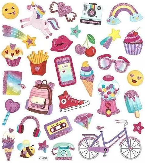 Papierowe naklejki z motywami stylowych przedmiotów, z brokatowym, różowym wykończeniem. W blistrze: jednorożec, tęcza, okulary, mufinki, serca a nawet fiołkowy rower.Słodkie kolory i brokatowe wykończenie nadają naklejkom typowo dziewczęcego charakteru. Te słodkie naklejki mogą być efektowną …