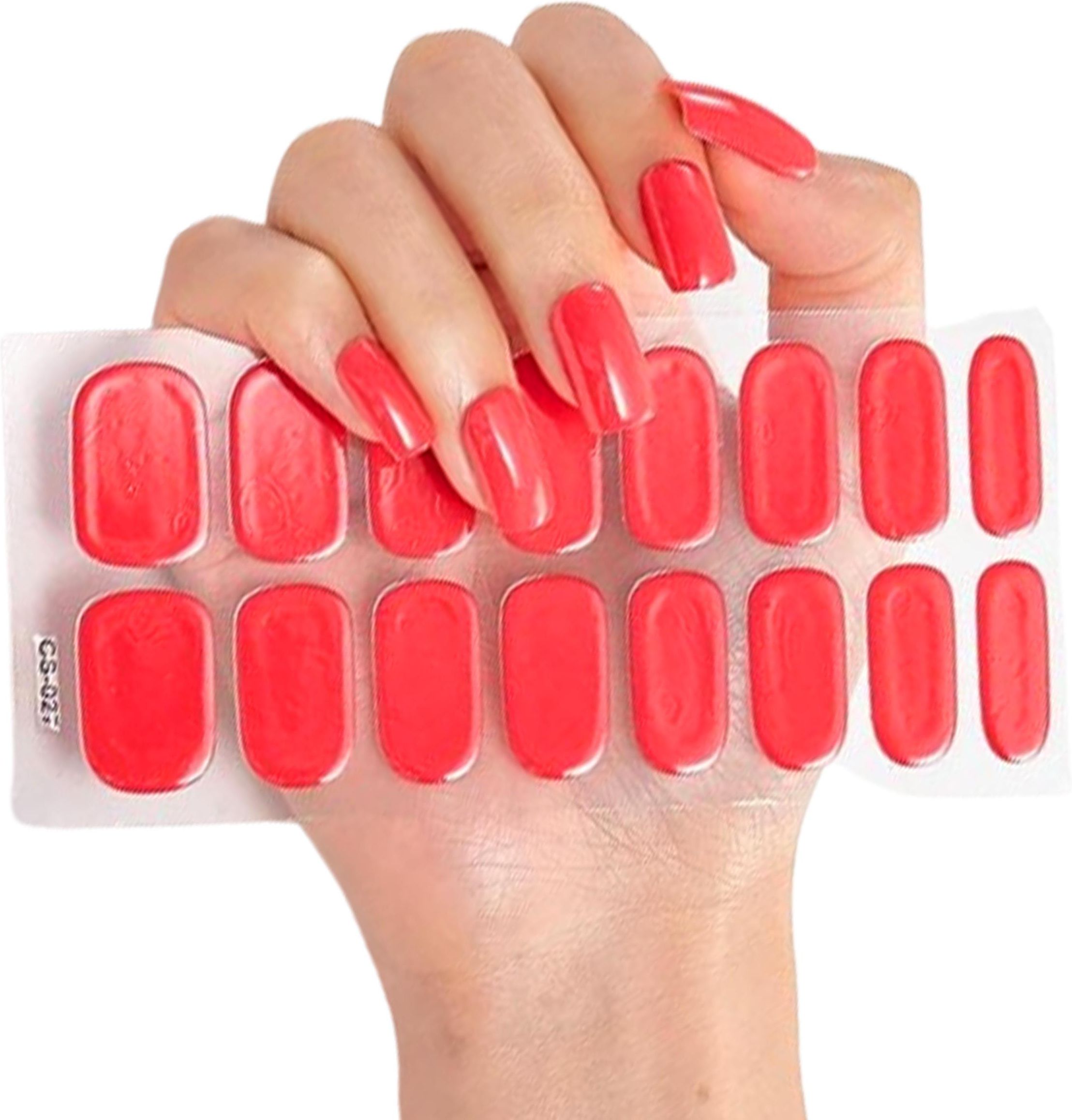 NAKLEJKI NA PAZNOKCIE ŻELOWE Samoprzylepne naklejki na paznokcie żelowe to szybki sposób na efektowny manicure w zaciszu domowym. Z powodzeniem mogą zastąpić tradycyjne lakiery do paznokci oraz hybrydowe. Dzięki nim stworzysz piękną stylizację w kilka chwil, bez obawy o zalane skórki. Łatwe w aplikacji. Naklejki na paznokcie w kolorze malinowej czerwieni prezentują się bardzo elegancko. Stylizacja w kolorze czerwionym jest ponadczasowa, przyciąga uwagę, jest gustowna, zmysłowa i wytworna. APLIKACJA nadaj pożądany kształt paznokciom, usuń skórki, usuń pył i odtłuść płytkę, poczekaj aż płytka wyschnie, wybierz odpowiedni rozmiar naklejki pasujący do naturalnej płytki, usuń z naklejki folię zabezpieczającą odklej naklejkę, przytrzymując jej prostokątny koniec, ostrożnie przyłóż zaokrąglony koniec do nasady paznokcia, po nałożeniu naklejki na paznokieć zaczynając od nasady wygładź ją gumowym kopytkiem lub drewnianym patyczkiem, uważając, aby nie powstały zagięcia i pęcherzyki. Szczególną uwagę należy zwrócić na boki i wolny brzeg paznokcia, nadmiar naklejki przy wolnym brzegu paznokcia należy spiłować pilniczkiem, kierując go ruchem z góry na dół, zalecamy zabezpieczenie naklejki topem i utwardzenie go w lampie UV/LED. USUWANIE paznokcie zamocz w ciepłej wodzie przez 3-5min delikatnie podważ naklejkę drewnianym patyczkiem, zaczynając od nasady paznokcia, pozostałości naklejki usuń wacikiem nasączonym acetonem. Arkusz zawiera 16 naklejek w 8 rożnych rozmiarach. UWAGA!! NIE SĄ TO NAKLEJKI UTWARDZANE W LAMPIE.