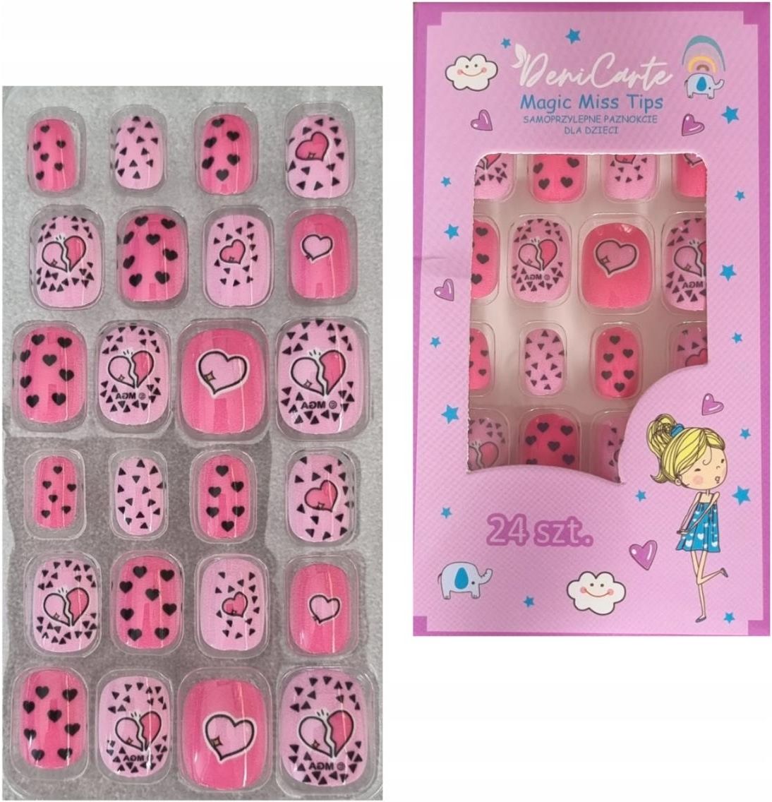 DENI CARTE ZESTAW SZTUCZNYCH PAZNOKCI DLA DZIECI 24SZT. SAMOPRZYLEPNE PAZNOKCIE DLA DZIECI 967 BROKEN HEART Jedyne w swoim rodzaju piękne sztuczne paznokcie dla dzieci ze zdobieniem w kształcie serduszka. Wykonane z wysokiej jakości materiału, nietoksyczne, bezzapachowe, trwałe i bezpieczne dla paznokcia dziecka. Paznokcie nie wymagają użycia dodatkowego kleju, od spodu umieszczona jest warstwa klejąca wykonana z przeźroczystego żelu, dzięki temu są bezpieczniejsze i bardziej praktyczne w użyciu. Zestaw zawiera 24 szt. Wszystkie paznokcie są w odcieniach różu. Są dziewczęce, idealne na wiosenne lub letnie stylizacje. Zestaw 24 szt. składa się z 3 różnych wzorów. Tipsy przedstawiają serduszka. Dwa odcienie różu. Romantyczne paznokcie dziecięce. Minimalistyczne czarne sreduszka Różowe serduszka, złamane serce. Zestaw dziecięcych paznokci posiada różnorodne rozmiary, dzięki czemu można idealnie dopasować tipsa do naturalnej płytki paznokcia. Paznokcie są łatwe w aplikacji. Wystarczy: oczyścić naturalne paznokcie, wybrać odpowiedni rozmiar, przyłożyć do naturalnej płytki, przycisnąć i GOTOWE! Łatwe w usunięciu: namocz paznokcie w ciepłej wodzie 5-10 min ściągnij delikatnie za pomocą drewnianego patyczka zaczynając od boku. Dla wydłużenia efektu po każdym myciu rąk lub innym kontakcie z wodą dociśnij tipsy do naturalnych paznokci.