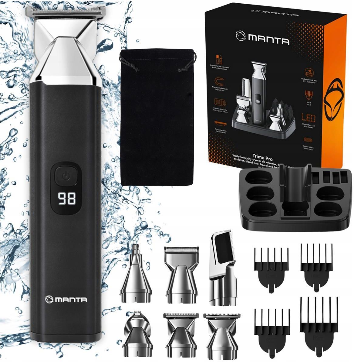 TRYMER MASZYNKA do strzyżenia golenia brody włosów uszu nosa TRIMO PRO Manta + aż 10 różnych końcówek oraz welurowe ETUI w zestawie! Najnowszy model trymera do włosów Manta TRIMO PRO, dokładny i funkcjonalny. Idealny do precyzyjnej pielęgnacji różnych partii ciała. Najważniejsze zalety: ☑️Ostrza najwyższej jakości, ☑️Precyzyjne oraz łatwe stylizowanie włosów, ☑️Aż 6 końcówek do różnych partii ciała oraz 4 końcówki oferujące różne długości strzyżenia, ☑️Czytelny wyświetlacz LED - informuje o poziomie baterii, konieczności naładowania, ☑️Wodoodporny na poziomie IPX7, ☑️Długi czas pracy na jednym ładowaniu - aż do 90 minut, ☑️Wszechstronny - do różnych partii ciała, ☑️Standardowy kabel USB-C, ☑️W zestawie wszystko, co potrzebne do pełnej obsługi i pielęgnacji, ☑️Elegancki, nowoczesny design. Czytelny wyświetlacz LED Czytelny, biały wyświetlacz LED na trymerze zapewnia łatwy odczyt wszystkich kluczowych informacji. Aż 6 różnych zastosowań ☑️ Końcówka mikro-goląca – doskonała do precyzyjnego golenia, idealna do uzyskania gładkiego wykończenia na delikatnych obszarach. ☑️ Końcówka do precyzyjnego przycinania – zapewnia wyjątkową dokładność przy stylizacji zarostu, brwi czy innych drobnych detali. ☑️ Końcówka do przycinania uszu/nosa – bezpieczna i skuteczna w usuwaniu niechcianych włosków z uszu i nosa, gwarantując komfort podczas użytkowania. ☑️Końcówka do przycinania włosków na ciele/ w okolicach intymnych – przeznaczona do pielęgnacji większych obszarów ciała oraz wrażliwych stref intymnych, zapewniając delikatne i skuteczne cięcie. ☑️Końcówka do stylizacji – umożliwia kreatywne modelowanie i kształtowanie zarostu lub włosów w różnych stylach. ☑️Końcówka pełnowymiarowa – idealna do ogólnego strzyżeniawłosów na głowie, zapewniająca szybkie i precyzyjne rezultaty na dużych powierzchniach. 4 końcówki do trymera ☑️Końcówka 3 mm – idealna do krótkiego strzyżenia, zapewniająca precyzyjne cięcie. ☑️Końcówka 6 mm – doskonała do średniej długości włosów, umożliwiająca naturalny wygląd. ☑️Końcówka 9 mm – przeznaczona do dłuższych cięć, idealna do stylizacji z większą objętością. ☑️Końcówka 12 mm – odpowiednia do uzyskiwaniajeszcze dłuższych fryzur, pozwalająca na swobodne modelowanie. Magnetyczne końcówki Magnetyczne końcówki w trymerze zapewniają szybkie i pewne mocowanie, umożliwiając łatwą wymianę. Dzięki tej innowacyjnej funkcji, zmiana końcówek jest prosta i wygodna. Precyzyjne ostrza Ostrza trymera cechują się wyjątkową precyzją i ostrością, co gwarantuje idealnie równe cięcie bez zbędnego wysiłku. Dzięki nim uzyskasz perfekcyjne rezultaty, a stylizacja stanie się szybka i wygodna, bez ryzyka szarpania włosów. IPX 7 Urządzenie charakteryzuje się klasą wodoodporności IPX7, co oznacza, że jest całkowicie odporny na zanurzenie w wodzie. Dzięki temu możesz bez obaw używać go pod prysznicem i łatwo czyścić pod bieżącą wodą, co zwiększa jego funkcjonalność i komfort użytkowania. Ładowanie USB-C Trymer wyposażony jest w nowoczesne ładowanie USB-C, które zapewnia szybkie i wygodne zasilanie urządzenia. Dzięki standardowi USB-C możesz łatwo podłączyć trymer do różnych źródeł zasilania, a jego uniwersalność i szybkość ładowania zapewniają gotowość do pracy zawsze, gdy tego potrzebujesz. Wyposażenie Przewód USB-C – umożliwiający szybkie i wygodne ładowanie urządzenia. Buteleczka z olejem – do naoliwienia ostrzy, co zapewnia ich długotrwałą ostrość i efektywność. Welurowe etui – eleganckie opakowanie, które zapewnia ochronę i porządek. Szczoteczka do czyszczenia – do łatwego usuwania resztek włosów i utrzymania trymera w idealnym stanie. Dwustronny grzebień – wszechstronny grzebień z różnymi długościami zębów do precyzyjnego stylizowania i rozczesywania włosów. Podstawka – stabilne miejsce do przechowywania trymera i akcesoriów, zapewniające porządek i wygodny dostęp. Zestaw prezentowy Elegancko zapakowany trymer do włosów będzie idealnym wyborem również na prezent!