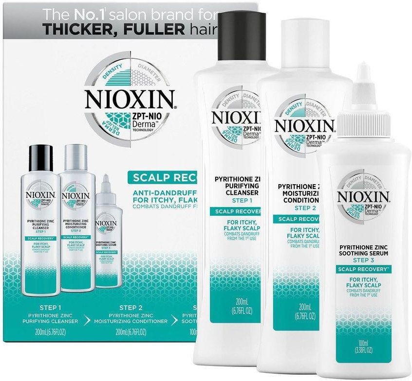 NioxinScalp Recovery zestaw przeciwłupieżowy do skóry głowy i wypadających włosów W zestawie: Szampon przeciwłupieżowy Nioxin Scalp Recovery Purifying Cleanser 200ml, Odżywka nawilżająca do włosów z łupieżem Nioxin Scalp Recovery Moisturizing Conditioner 200ml, Serum łagodzące do skóry głowy Nioxin …