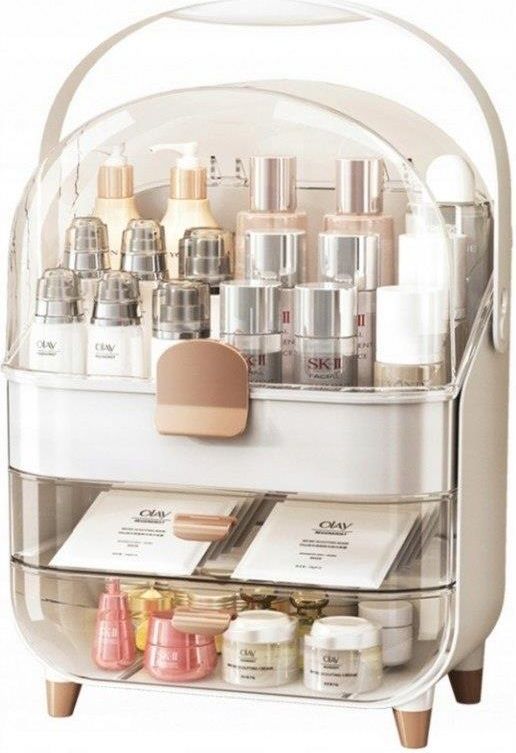 Stylowy i Funkcjonalny Organizer na Kosmetyki – Elegancja i Porządek w Jednym Poznaj organizer, który odmieni Twoją codzienną pielęgnację i styl przechowywania kosmetyków. Zaprojektowany z myślą o funkcjonalności i estetyce, sprawdzi się zarówno na toaletce, jak i w podróży. Cechy produktu Duża pojemność: Idealny do przechowywania kosmetyków, perfum i akcesoriów pielęgnacyjnych. Przejrzysta pokrywa: Chroni Twoje produkty przed kurzem i wilgocią, jednocześnie pozwalając zobaczyć, co jest w środku. 2 szuflady: Doskonałe na drobiazgi, takie jak pędzle, waciki, gąbki czy inne małe akcesoria. Wodoszczelny i pyłoszczelny: Zapewnia bezpieczeństwo przechowywania kosmetyków nawet w wilgotnych pomieszczeniach. 4 nóżki: Stabilne i bezpieczne ustawienie na każdej powierzchni. Składana rączka: Ułatwia przenoszenie – organizer jest lekki i wygodny do transportu. Dane techniczne Wymiary: 26,5 x 18,2 x 34,5 cm Waga: 1,2 kg Kolor: Biały Materiał: Akryl Pojemność: XXL Dlaczego warto wybrać ten organizer? Porządek na wyciągnięcie ręki: Dzięki przemyślanej konstrukcji wszystkie Twoje kosmetyki znajdą swoje miejsce. Elegancki design: Subtelna biel i transparentna pokrywa w stylu vintage dodadzą szyku każdemu wnętrzu. Wszechstronność: Organizer sprawdzi się zarówno w domu, jak i podczas wyjazdów – jest lekki, kompaktowy i łatwy do przenoszenia. Zainwestuj w porządek i styl – wybierz organizer, który idealnie spełni Twoje potrzeby i będzie doskonałym dodatkiem na Twojej toaletce. Wszechstronne zastosowanie Łazienkowy organizer - Przezroczysta górna pokrywa, nie boi się plam z kurzu i wody, nadaje się do kosmetyków do pielęgnacji skóry w łazience, bezpieczna w użyciu. Organizer na komodę - Trzypółkowa konstrukcja o dużej pojemności, idealna ekspozycja kosmetyków na komodzie w sypialni. Przenośny organizer podróżny - Konstrukcja uchwytu sprawia, że organizer jest łatwy do przenoszenia i przenoszenia, zabierz go ze sobą w podróż. Elegancki organizer na blacie - Prosta konstrukcja dopasowuje się do każdego stylu, nawet na zwykłym blacie prezentuje się jako szykowna toaletka.