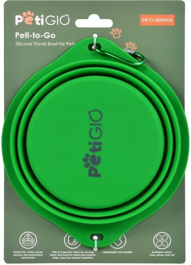 Silikonowa miska podróżna dla zwierząt Peti-to-Go PETI-180GREEN 5906630333073 Składana, lekka i wygodna miska o pojemności 600 ml. Wykonana z wytrzymałego silikonu, idealna na spacery i podróże. Możliwość przypięcia do smyczy. Silikonowa miska podróżna dla zwierząt Peti-to-Go PETI-180GREEN Praktyczna i wygodna miska dla Twojego pupila! Silikonowa miska Peti-to-Go to doskonały wybór na każdą podróż ze zwierzakiem, zapewniająca komfort i porządek podczas spacerów. Dzięki lekkiej i składanej konstrukcji zajmuje minimalną ilość miejsca i jest niezwykle wygodna w użyciu. Kompaktowa i składana – składa się na płasko, dzięki czemu łatwo ją przechowywać i transportować. Wytrzymały silikon – bezpieczny i odporny na uszkodzenia materiał. Łatwe mocowanie – możliwość przypięcia do smyczy, plecaka lub torby. Idealna na wodę i karmę – pojemność 600 ml pozwala na wygodne podawanie wody lub jedzenia. Niezastąpiona podczas każdej podróży z pupilem!