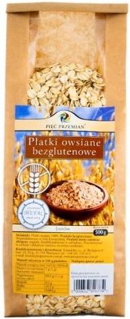 Składniki: 100% płatki owsiane. Wartość odżywcza w 100 g produktu: Wartość energetyczna: 368kcal/1522kJ, Tłuszcz 7.0g w tym nasycone 1.0g, Węglowodany 60,5g w tym cukry 1,1g, Białko 10,3g, Błonnik 8,3g, Sól 0,003g. Masa netto: 500 gramów. Właściwości: Bezglutenowe płatki owsiane są bogatym źródłem błonnika pokarmowego, który dobroczynnie oddziałuje na pracę układu pokarmowego. Błonnik usprawnia pracę jelit, sprawia, że pokarm jest dłużej i lepiej trawiony, wspomaga oczyszczanie organizmu z toksyn oraz pomaga w walce z zaparciami. Płatki owsiane zawierają także białko, które jest niezbędne dla zapewnienia właściwego funkcjonowania organizmu, prawidłowego wzrostu i odbudowy komórek. Szczególnie wskazane dla osób, które cenią zdrowy tryb życia i zdrowe odżywianie. Stanowią idealne rozwiązanie dla osób na diecie bezglutenowej oraz osób chorych na celiaklię. Stosowanie: Płatki owsiane bezglutenowe Jumbo firmy Pięć Przemian polecane są do wypieków i gotowania. Są niezastąpionym składnikiem musli, czy owsianki. Producent: Pięć Przemian – Simpatiko s.c. ul. Łuże 20. 05-092 Łomianki