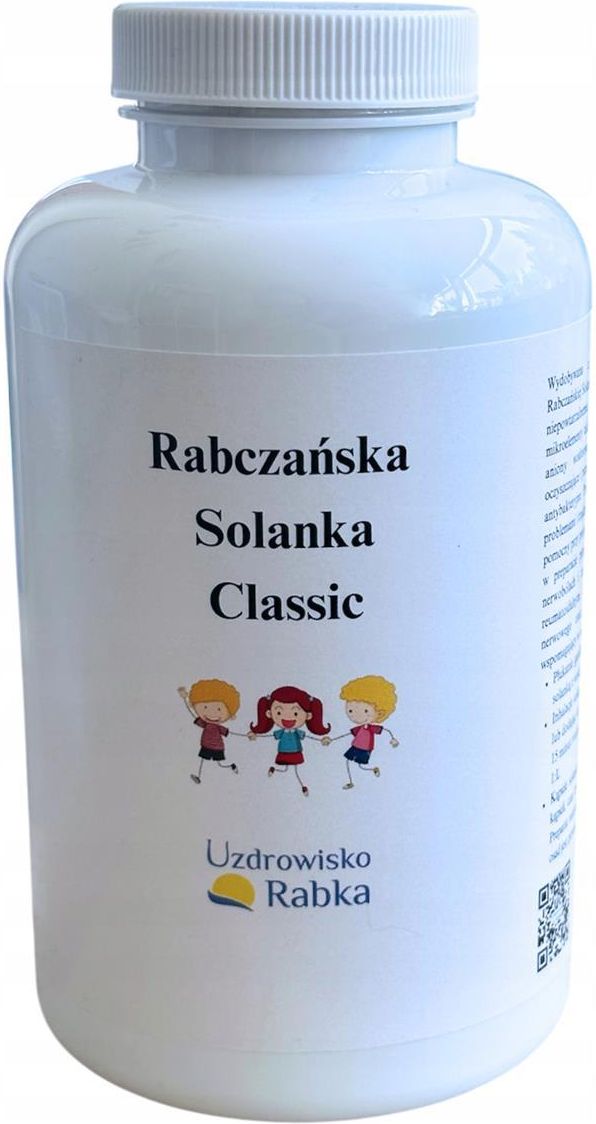 Rabczańska Solanka Classic UZDROWISKO RABKA 0,5 l Składniki solanki posiadają działanie antybakteryjne. Rabczańska Solanka dzięki bogatemu i niepowtarzalnemu składowi zawierającemu m.in biopierwiastki i mikroelementy takie jak: sód, brom, jod, bor, mangan, wapń oraz aniony wodorowęglanowe i chlorkowe - wykazuje działanie oczyszczające i przeciwzapalne. Naturalne składniki zawarte w preparacie przenikając przez skórę działają wspomagająco w nerwobólach i zmianach zwyrodnieniowych stawów o podłożu reumatoidalnym. Doskonale sprawdza się w stanach pobudzenia nerwowego oraz zaburzeniach snu. Polecany jako preparat wspomagający w okresach rekonwalescencji. Preparat przeznaczony jest do pielęgnacji skóry z problemami: trądzik łojotok łuszczyca grzybica oraz jako środek pomocny przy problemach alergicznych. Stosowanie Płukanie gardła i jamy ustnej kilka razy dziennie rozcieńczoną solanką z wodą przegotowaną w stosunku 1:1 Inhalacje solankowe można wykonywać przy pomocy nebulizatora lub dodając do solanki gorącą wodę;inhalować się przez ok. 10-15 minut, rozcieńczoną solanką z wodą przegotowaną w stosunku 1:1 Kąpiele solankowe - 1L solanki wystarczy na przygotowanie kilku kąpieli; czas trwania kąpieli: dorośli 15-20 minut, dzieci 5-10 minut. Przemywanie skóry, włosów i paznokci po codziennej kąpieli Składniki aktywne zawarte w formule wspierają Odżywianie, nawilżanie, wygładzanie i ujędrnianie skóry Hamowanie procesów starzenia się skóry Redukcję, rozstępów, wyprysków i cellulitu Łagodzenie dolegliwości łuszczycowych Działania przeciwzapalne, przeciwgrzybiczne i antybakteryjne Skład Zawartość NaCl od 19 600 do 23 900 mg/dm3 Zawartość jonów Ca 2+ od 90 do 110 mg/dm3 Zawartość jonów Mg2+ od 40 do 50 mg/dm3 Zawartość jonów Br- od 36 do 45 mg/dm3 Zawartość jonów J- od 16 do 20 mg/dm Preparat naturalny, bez konserwantów i barwników. Wytrącający się osad jest zjawiskiem naturalnym. Nie był testowany na zwierzętach na żadnym etapie produkcji. --- Certyfikaty i ostrzeżenia dotyczące bezpieczeństwa Spełnia wymagania dyrektywy RoHS (ograniczenie stosowania niebezpiecznych substancji). Unikać kontaktu z oczami. W przypadku dostania się produktu do oczu, natychmiast przemyć je wodą. Testowany dermatologicznie pod kątem bezpieczeństwa dla skóry. Dla dzieci powyżej 3 roku życia. Zalecany nadzór osoby dorosłej. Przechowywać w suchym i chłodnym miejscu. Nie spożywać. W razie połknięcia natychmiast skontaktować się z lekarzem. Pojemność: 0,5l