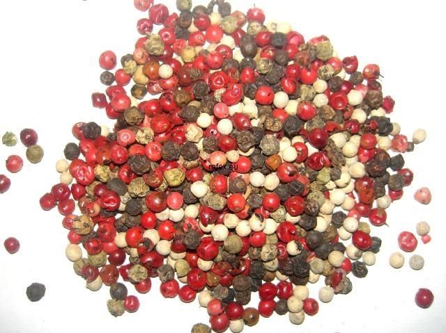 Skład: pieprz czerwony, pieprz zielony, pieprz biały, pieprz czarny. Charakterystyka: Co stanie się, gdy zmieszamy razem cztery odmiany pieprzu: zielony, czarny, czerwony i biały, popularnie stosowane w kuchni? Powstanie charakteryzująca się nietuzinkowym smakiem i niejednolitym aromatem kolorowa mieszanka, którą doceni każdy smakosz. Dodatkowo ze względu na swój wygląd pieprz kolorowy stanowi piękną dekorację dla przygotowanych dań. Zastosowanie: Pieprz kolorowy można stosować w całych ziarnach oraz mielony. Mielony jest o wiele bardziej uniwersalny i sprawdzi się praktycznie w każdym daniu. Dodać można go do gulaszu, ryb, warzy, potraw mięsny, serów, zapiekanek, sosów, jaj, makaronów czy sałatek. Całe ziarna stosuje się najczęściej do dań w których mogą się one nieco dłużej pogotować, czyli są to głównie zupy, buliony oraz sosy. Całe ziarna można również stosować do różnych marynat. Ciekawostki: W skład mieszanki wchodzą cztery najpopularniejsze rodzaje pieprzu, jednak nie są to jedyne znane na świecie. Obecnie wyróżnia się ponad 700 odmian tej przyprawy a najbardziej typową jest pieprz czarny.