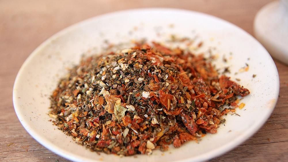 Skład: cząber, sól, pomidor, czosnek niedźwiedzi, czarnuszka, bazylia, oregano, czosnek grys, cebula grys Charakterystyka: Wyjątkowa mieszanka przypraw. Połączenie śródziemnomorskich pomidorów i oregano i bazylii z czosnkiem niedźwiedzim oraz czarnuszką. Przyprawa uniwersalna, która pasuje zarówno …