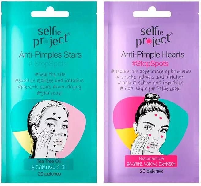 Zestaw plastrów punktowych na wypryski Selfie Project zawiera plastry Anti - Pimple Stars 20 sztuk oraz plastry Anti - Pimple Heart 20 sztuk.