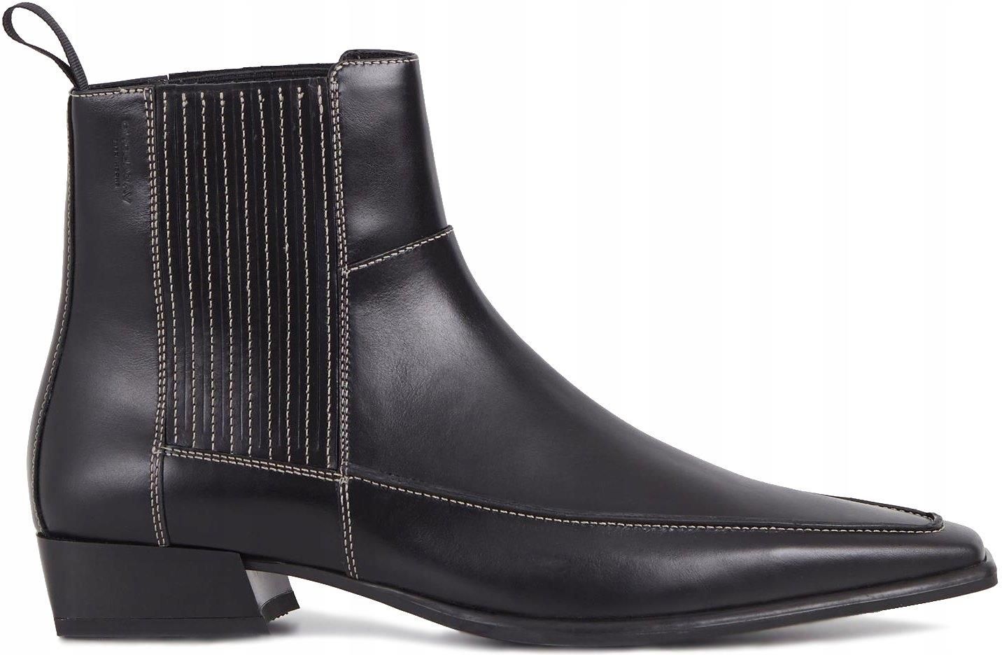 BOTKI VAGABOND r. 38 Nella to wyrafinowane kowbojskie botki w stylu western z elegancką sylwetką. Model ten został wykonany z czarnej skóry. Charakteryzuje się spiczastymi noskami, elastycznymi fałdowanymi panelami po bokach oraz ozdobnymi szwami wzdłuż górnej części buta. Skośne obcasy mają …