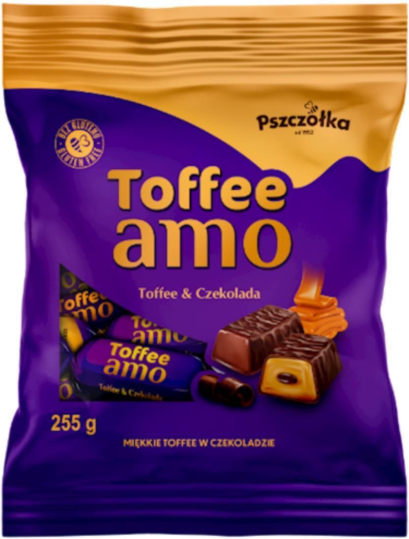 Cukierki miękkie toffee w czekoladzie Toffee Amo PSZCZÓŁKA BEZGLUTENOWE Cukierki w delikatnej czekoladzie z przepysznym toffe i kakaową łezką w środku Miękka masa toffee oblana pyszną deserową czekoladą, która delikatnie rozpływa się w ustach – tak najprościej można opisać Toffee Amo. To propozycja …