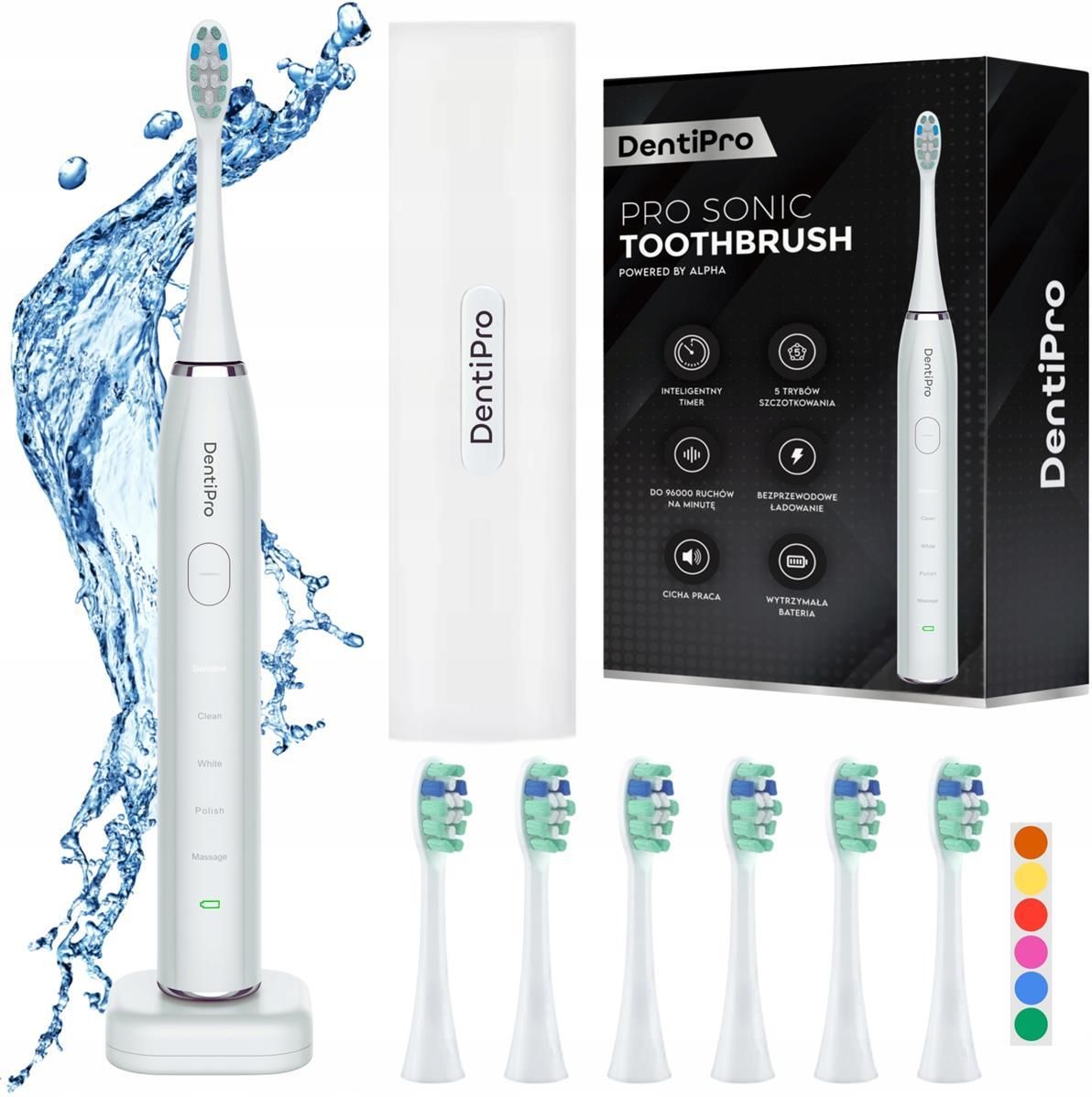 SZCZOTECZKA SONICZNA DO ZĘBÓW - ZESTAW ETUI + 6 KOŃCÓWEK - ELEKTRYCZNA ZADBAJ O TWÓJ PIĘKNY UŚMIECH RAZEM Z NAMI Szczoteczka DentiPro to szczoteczka która pomimo swojej przystępnej ceny, charakteryzuje się parametrami zbliżonymi, a często lepszymi od znacznie droższych urządzeń. Jeśli chcesz cieszyć się zdrowym i pięknym uśmiechem oraz satysfakcją z zakupu - nasz sprawdzony model szczoteczki sonicznej zapewni Ci higienę jamy ustnej na najwyższym poziomie. Szczoteczka jest wodoodporna, wyposażona w 6 wymiennych głowic, co zapewni Ci zapas na 18 miesięcy, zestaw posiada etui podróżne, dzięki któremu możesz zabrać ze sobą szczoteczkę w podróż bez obawy o uszkodzenia! Pojemny akumulator pracuje na pełnym naładowaniu aż do 45 dni. Dzięki 96 000 drgań sonicznych na minutę, skutecznie usuwa płytkę nazębną i resztki jedzenia nawet z trudno dostępnych miejsc. Dodatkowo, w zestawie znajdziesz gratis: praktyczne naklejki, które pomogą w łatwym oznakowaniu końcówek szczoteczek. NIEZBĘDNE TRYBY PRACY DLA PIĘKNEGO UŚMIECHU Szczoteczka soniczna DentiPro została wyposażona w 5 trybów pracy, co pozwala dopasować jej działanie do Twoich potrzeb oraz wrażliwości zębów. Posiada też funkcję zapamiętywania ostatniego trybu pracy dzięki czemu nie musisz za każdym razem ustawiać swojego trybu ponownie. Sensitive (Delikatny): Tryb dla osób z wrażliwymi zębami lub dziąsłami. Zapewnia delikatne czyszczenie, minimalizując ryzyko podrażnień. Świetny dla tych, którzy potrzebują bardziej łagodnego podejścia oraz dla osób z problemami z przyzębiem, mostami i koronami. Clean (Czyszczenie): Standardowy tryb do codziennego czyszczenia. Usuwa płytkę nazębną i resztki jedzenia, zapewniając dokładne i skuteczne czyszczenie. Doskonały wybór do codziennego stosowania. White (Wybielanie): Tryb zaprojektowany do usuwania przebarwień z powierzchni zębów. Skutecznie pomaga odzyskać naturalną biel zębów, polerując je i usuwając osady. Idealny dla tych, którzy chcą mieć jaśniejszy uśmiech. Polish (Polerowanie): Tryb, który wygładza i poleruje powierzchnię zębów, nadając im blask. Idealny dla osób chcących uzyskać gładki i lśniący wygląd zębów. Massage (Pielęgnacja dziąseł): Tryb delikatnego masażu dziąseł, który poprawia ich ukrwienie i wzmacnia je. Szczoteczka DentiPro posiada inteligentny system ładowania, który zapobiega przeładowaniu baterii i dba o jej długą żywotność. Gdy akumulator jest w pełni naładowany, wskaźnik świeci na zielono i ładowanie jest automatycznie blokowane. Dopiero po spadku poziomu baterii i zapaleniu się czerwonego wskaźnika, urządzenie umożliwia ponowne ładowanie, co zwiększa efektywność energetyczną i wydłuża czas pracy akumulatora. INTELIGENTNY TIMER DLA PERFEKCYJNEGO SZCZOTKOWANIA Inteligentny timer w szczoteczce DentiPro został zaprojektowany z myślą o prawidłowej technice szczotkowania. Urządzenie co 30 sekund wykonuje krótką przerwę, sygnalizując konieczność zmiany obszaru czyszczenia — dzięki temu każda część jamy ustnej otrzymuje odpowiednią uwagę. Po 2 minutach szczoteczka automatycznie się wyłącza, co odpowiada czasowi zalecanemu przez stomatologów. Ten system nie tylko ułatwia codzienną higienę, ale także pomaga wyrabiać nawyki, zapewniając dokładne i równomierne szczotkowanie każdego dnia. NAJWAŻNIEJSZE CECHY I ZALETY SZCZOTECZKI SONICZNEJ DO ZĘBÓW DENTIPRO 96 000 drgań sonicznych na minutę zapewnia wyjątkowo głębokie i delikatne czyszczenie, docierając do trudno dostępnych miejsc. 5 trybów pracy umożliwia Ci dostosowanie szczotkowania do indywidualnych potrzeb. Inteligentny timer pomaga utrzymać zalecany przez dentystów czas szczotkowania, dbając o równomierne czyszczenie wszystkich partii jamy ustnej. Wykonanie końcówek z oryginalnych włókien DuPont - trwałe, bezpieczne i delikatne dla dziąseł. Zachowują sprężystość i skuteczność czyszczenia przez wiele tygodni. Około 45 dni pracy na jednym ładowaniu sprawia, że szczoteczka jest wygodna w codziennym użytkowaniu, zwłaszcza podczas podróży. Zapas wymiennych końcówek na 18 miesięcy gwarantuje Ci długotrwałe użytkowanie bez konieczności częstego zakupu nowych końcówek. Wodoszczelność IPX7 to bezpieczeństwo i komfort użytkowania nawet pod prysznicem czy w wannie. Ładowanie indukcyjne eliminuje konieczności podłączania kabli, co zwiększa wygodę i estetykę użytkowania. Białe etui podróżne to stylowy dodatek i praktyczne przechowywanie szczoteczki w podróży. Czytelny, podświetlany wyświetlacz tołatwość obsługi i monitorowania trybów pracy nawet w słabym oświetleniu. Biała szczoteczka stworzona wnowoczesnym, eleganckim designie, który wpisuje się w stylowe wnętrza łazienki. PRZEWAGA SZCZOTECZKI SONICZNEJ NAD MANUALNĄ Korzystanie ze szczoteczki sonicznej jest przyjemniejsze i wygodniejsze: Wbudowany timer pomaga utrzymać zalecany czas szczotkowania. Lepiej dociera do trudno dostępnych miejsc (szczoteczki soniczne usuwają nawet do 7x więcej płytki nazębnej niż szczoteczki tradycyjne). Zmniejsza krwawienie i zapalenie dziąseł. Pomaga w usuwaniu kamienia nazębnego. Szczoteczka soniczna DentiPro w porównaniu do szczoteczek elektrycznych jest dokładniejsza oraz delikatniejsza dla zębów i dziąseł. CO JESZCZE WARTO WIEDZIEĆ O SZCZOTECZCE SONICZNEJ ALPHA? Dane techniczne i wymiary Wysokość: 23,5 cm; Szerokość: 2,5 cm; Ilość trybów pracy: 5 Materiał wykonania: ABS Ilość wymiennych końcówek: 6 Inteligentny timer: Tak Ilość drgań sonicznych: 96 000 Wodoszczelność: IPX7 Sposób ładowania: ładowanie indukcyjne Podświetlany wyświetlacz: Tak Instrukcja obsługi w języku polskim: Tak Długość pracy na pełnym naładowaniu: do 45 dni Kolor: biały Zawartość zestawu Szczoteczka soniczna do zębów DentiPro Etui podróżne Komplet 6 wymiennych głowic Stacja indukcyjna