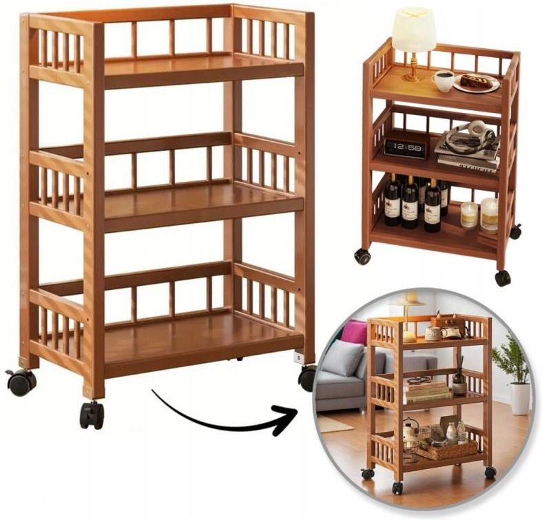 Bambusowy regał mobilny na kółkach – funkcjonalność i naturalny styl Utrzymanie porządku w domu nie musi być trudne. Bambusowy regał na kółkach to praktyczne i estetyczne rozwiązanie, które pomoże Ci zorganizować przestrzeń w łazience, kuchni, sypialni, garderobie czy biurze. Dzięki mobilnej konstrukcji możesz z łatwością przestawiać go w dowolne miejsce, dokładnie tam, gdzie jest potrzebny. Trzy pojemne półki pomieszczą drobne i średnie akcesoria, kosmetyki, tekstylia, dokumenty czy ubrania. Naturalny bambus w połączeniu ze stonowaną kolorystyką sprawia, że regał doskonale wpasuje się w różne style wnętrz – od nowoczesnych po skandynawskie. Cechy produktu: Solidny stelaż wykonany z bambusa Trzy funkcjonalne poziomy półek Mobilna konstrukcja na kółkach Lekki, a jednocześnie wytrzymały Łatwy w utrzymaniu czystości Produkt do samodzielnego montażu Sprzedawany w estetycznym pudełku Bambusowy regał mobilny to idealne połączenie funkcjonalności, mobilności i naturalnego designu – doskonały wybór do każdego wnętrza. Wymiary: Wysokość: 82 cm Szerokość: 50 cm Głębokość: 30 cm Wymiary opakowania: 82 x 32 x 6 cm Waga: 3,5 kg brutto Materiał: bambus, MDF