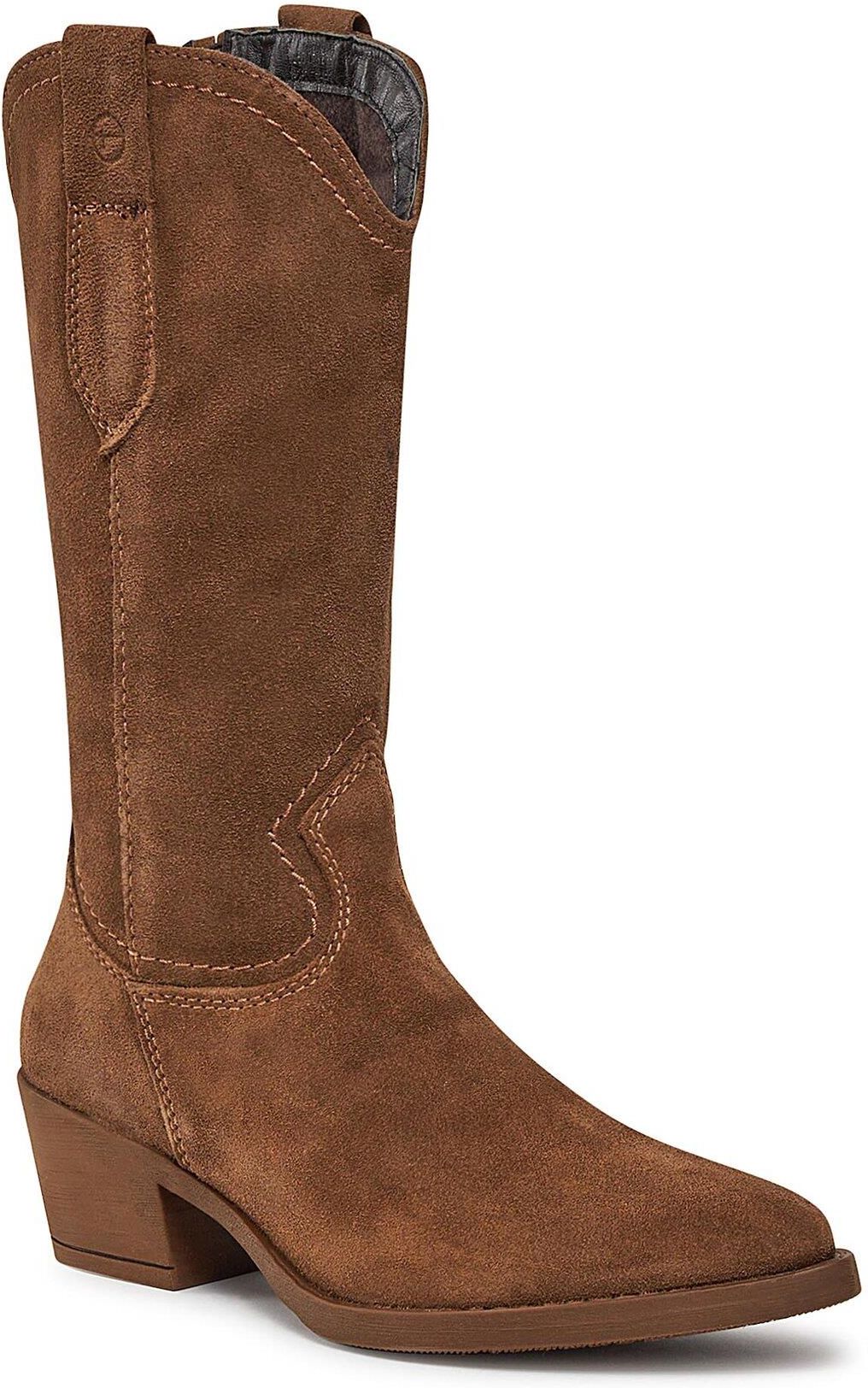 Kowbojki damskie niemieckiej marki TAMARIS wykonane z naturalnej, miękkiej skóry welurowej w kolorze ciemno beżowym nosek ukształtowany w szpic ozdobne przeszycia na cholewce środek lekko ocieplany tkaniną z mikrofibry miękka, komfortowa wkładka stabilny obcas o wysokości 5.5 cm