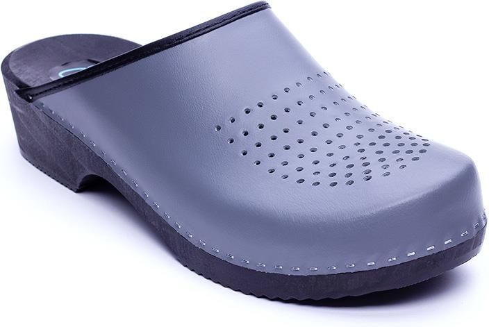 Chodaki meskie spód drewno topola, bejcowane na czarno, podbite gumką antyposlizgową. Wyprofilowane ortopedycznie. Skóra bydlęca kolor szary z wentylacja i czarna lamówką