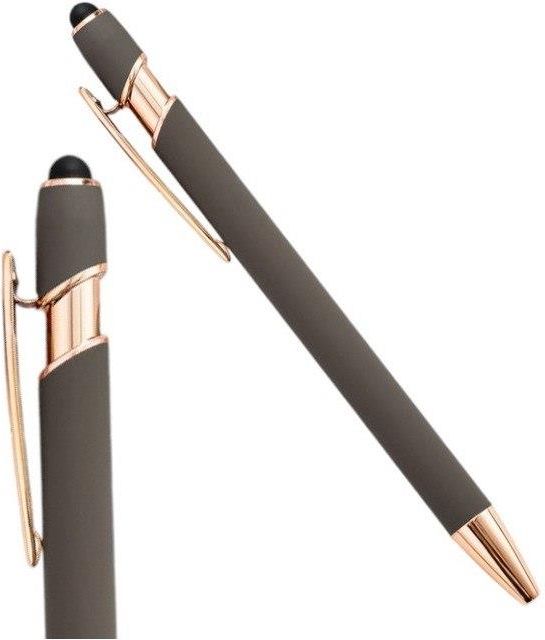 Metalowy długopis z powierzchnią soft touch, różowo złotymi elementami, niebieskim wkładem i końcówką touch pen. Specyfikacje: Kolor długopisu: szary Kolor tuszu: czarny Materiał: metal Wymiary: 14,3 cm x1cm Waga: 20g