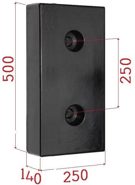 Szerokość: 250 mm Wysokość: 500 mm Grubość: 140 mm Rozstaw otworów montażowych: 250 mm Otwór na śrubę: Ø22 mm Otwór pod podkładkę: Ø60 mm Wgłębienie na nakrętke: 60 mm Twardość: 62° Shore’a