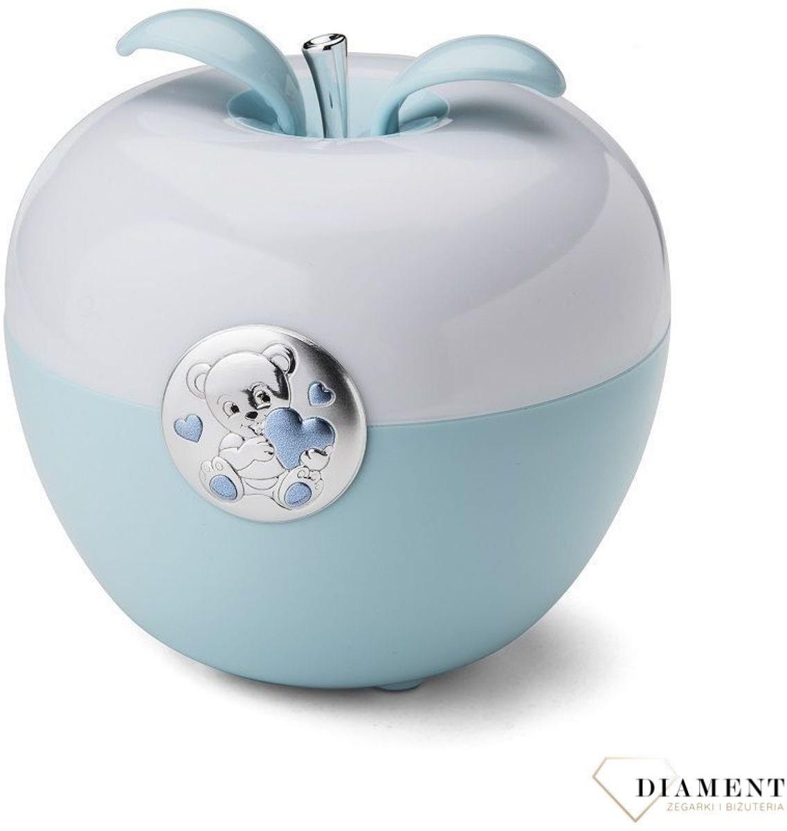 Urocza lampka nocna w kształcie jabłuszka z okrągłym emblematem z wizerunkiem misia pluszowego ze srebra. Lampka idealnie wpasuje się w każdym pokoju dziecięcym. Dzięki niej, w pokoju dziecka zapanuje bardzo miła i sprzyjająca do zasypiania atmosfera Emblemat wykonany z wysokiej jakości metalu pokrytego srebrem i lakierem zabezpieczającym, dzięki któremu na długi okres czasu zachowa on swój blask. Doskonały upominek na chrzest i urodziny. Lampka kontrolowana nadmuchem. W zestawie dołączony jest przewód o długości 1 metra umożliwiający zasilanie z dowolnego gniazda USB. Świeci delikatnie, ciepłym odcieniem światła, można również włączyć kolorowe barwy. Średnica: 12cm Wysokość: 11cm Nasz sklep internetowy z pamiątkami na Chrzest jest autoryzowanym sprzedawcą najwyższej jakości dewocjonaliów w Polsce. Cała kolekcja pamiątek dla dzieci zakupiona w naszym sklepie posiada 2 letnią gwarancję i zapakowane są w oryginalne opakowanie.